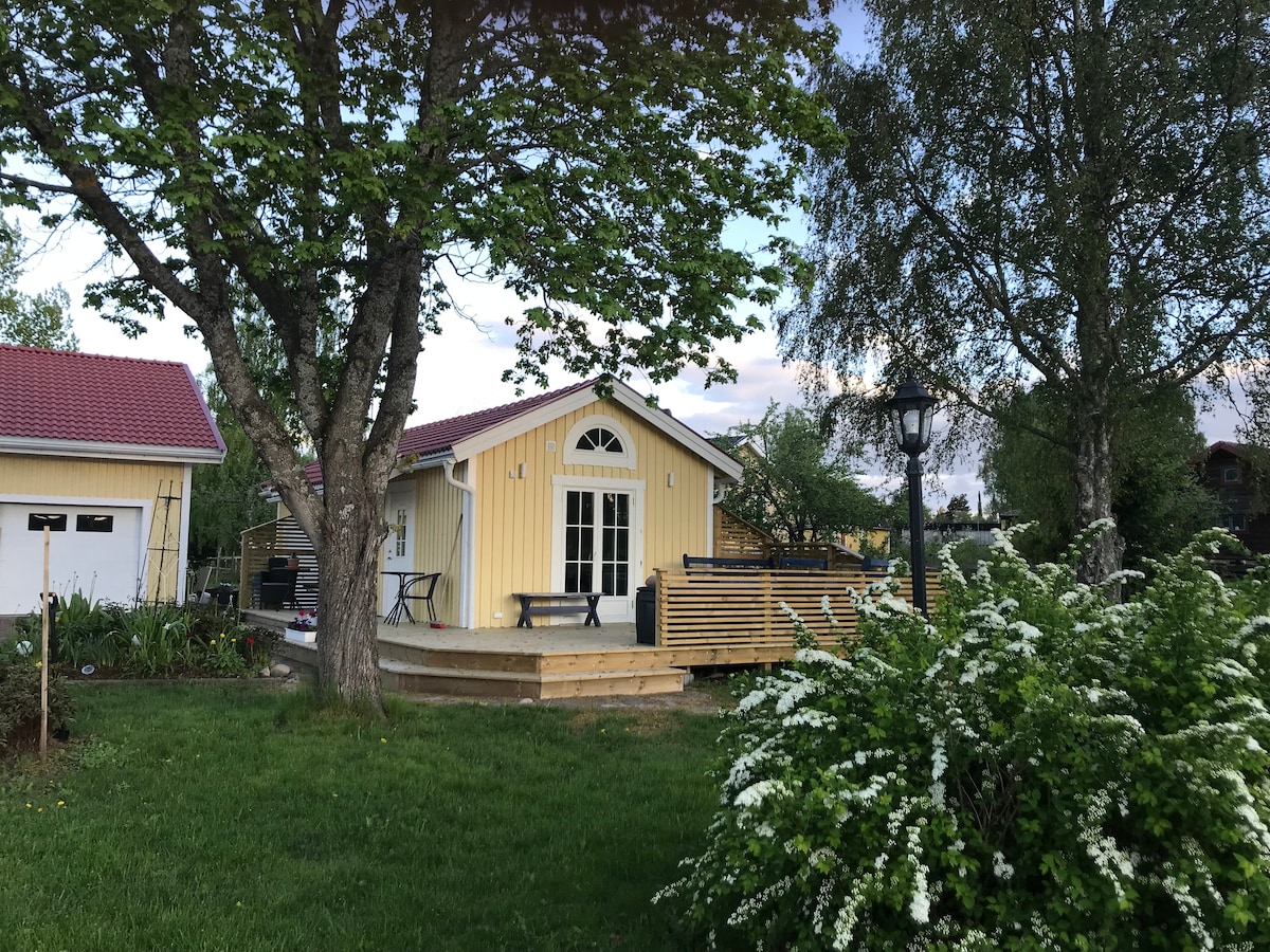 2 adultes et 1 enfant. Chalet frais et confortable. Douche et toilettes dans le chalet. Une grande chambre avec cuisine. Grande terrasse. Superbe vue sur le lac d'Orsa, les montagnes, les champs et les prairies. Notre merveilleux jardin avec des pommiers, des framboises, des fleurs, etc. Ici, vous pouvez vous reposer et recharger vos batteries. Il est à environ 3 km du centre-ville d'Orsa. Une vie ornithologique riche. À 20 min de Grönklitt. Orsasjön avec patinage longue distance et pistes de ski. À 15 km de Mora et de Vasaloppet.