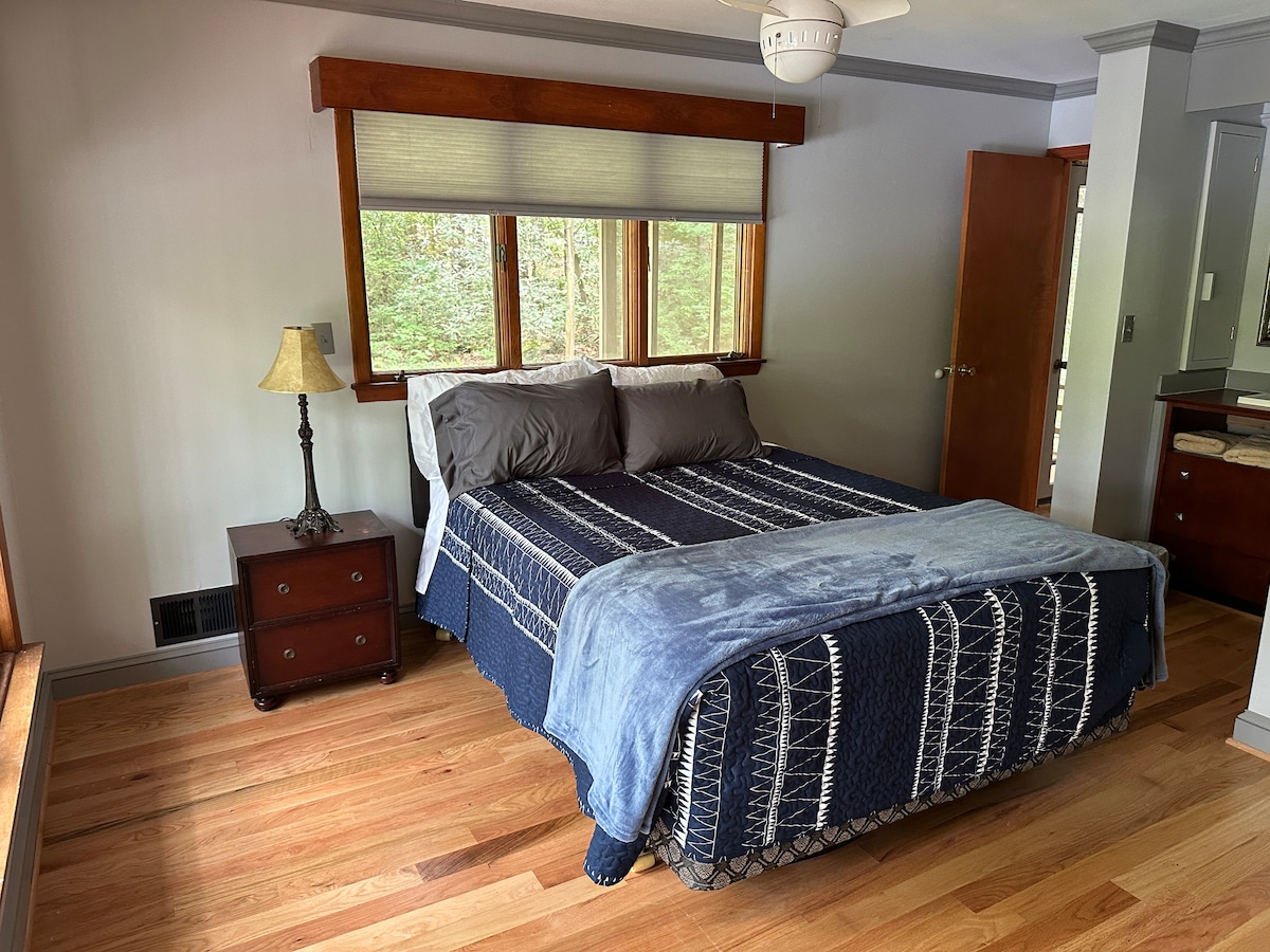C'est une maison de fête pour deux couples et deux enfants. Elle est privée et isolée. Vous disposerez de deux chambres avec lit queen et vue sur le lac. La chambre d'enfant dispose de deux lits jumeaux. Il y a 2 salles de bain et demie. Il y a un porche grillagé et une terrasse avec barbecue. Vous serez dans les bois, au bord d'un lac. Vous n'avez pas besoin de vous taire. Vous pouvez pêcher, nourrir les tortues, marcher dans les bois et observer la faune. Vous avez un garage pour deux voitures. Il y a une buanderie et un espace de travail dédié avec une imprimante.
