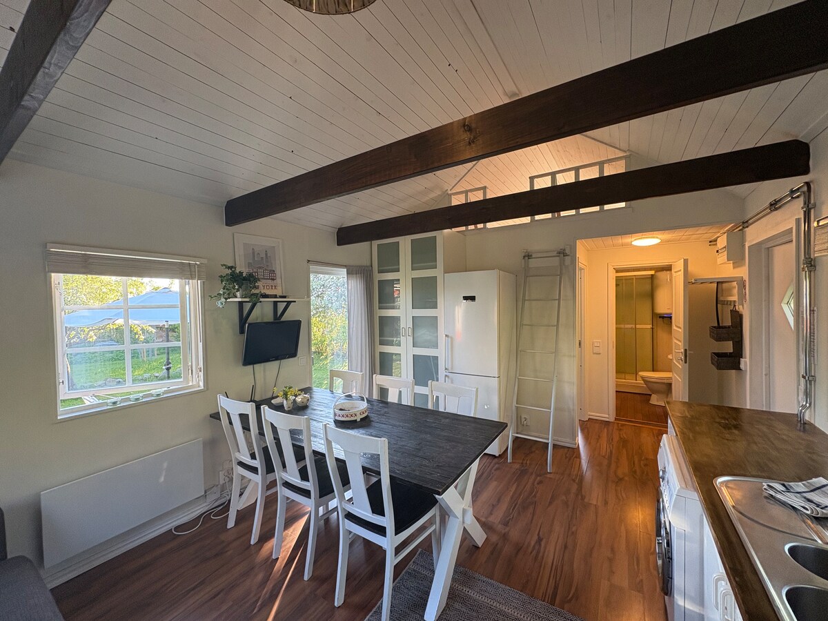 Insta--> #JohannesCabin Détendez-vous dans cet espace unique et tranquille. Faites comme chez vous, mais mieux et plus charmant. Ici, vous dormez dans un lit double (160 cm de large) sur un loft. Spacieux en bas avec salon et cuisine en un (possibilité de couchage dans un canapé de 180 cm de long). Salle de bain avec douche et lave-linge et sèche-linge combinés. Magnifique patio avec verdure. Parfait pour préparer le dîner à l'intérieur ou à l'extérieur sur le barbecue. Pour plus d'informations, suivez-nous sur Insta--> #JohannesCabin.