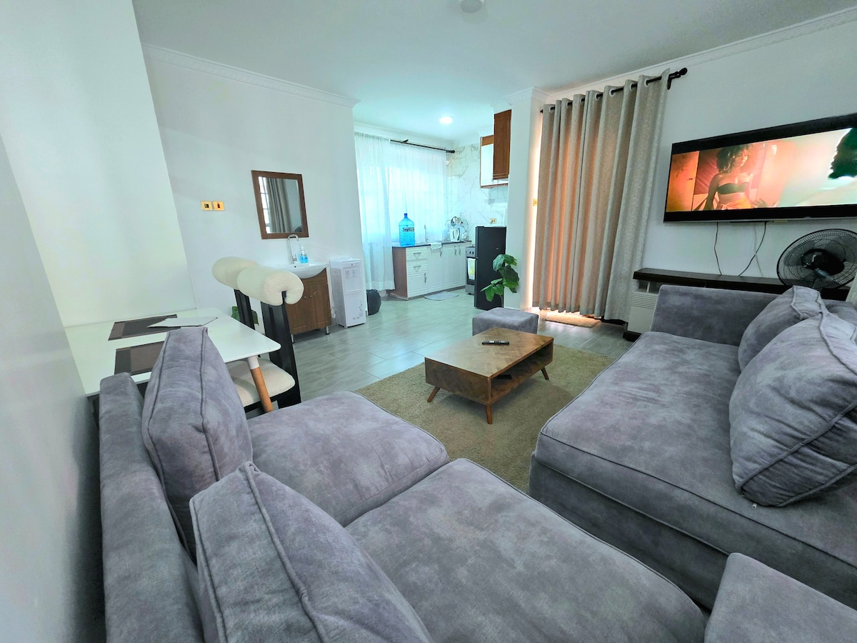Imaginez un appartement confortable de deux chambres, méticuleusement aménagé pour offrir un séjour agréable aux voyageurs. Entrez et soyez accueilli par une ambiance chaleureuse et accueillante. L'entrée s'ouvre sur un salon spacieux, orné d'un mobilier de bon goût et d'un éclairage chaleureux. Un canapé moelleux, orné de coussins colorés, invite les voyageurs à se détendre après une journée passée à explorer la ville. Une grande télévision à écran plat fixée au mur offre des options de divertissement, y compris des services de streaming.