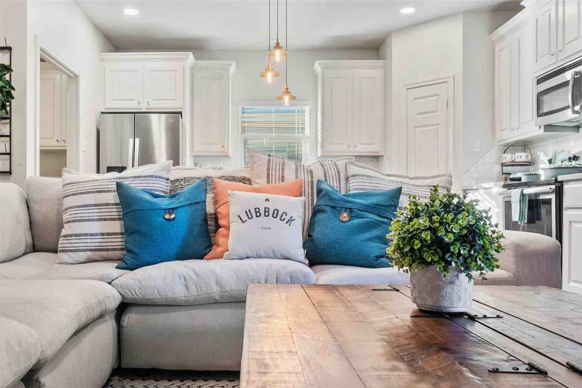 Nous sommes idéalement situés à 10 minutes de TTU, accès facile à l'I-27. NEUF au sud de Lubbock. La maison a un charme texan amusant avec une sensation de maison grande et confortable. Avec une ferme exceptionnelle + une touche colorée, vous pouvez être assuré que vous passerez un merveilleux séjour dans notre humble maison 3/2. Grandes chambres et salles de bains avec doubles lavabos. Accès complet au bar à café, au wifi, aux lits confortables, à la cheminée et au magnifique patio extérieur ; vous avez trouvé votre maison loin de chez vous à The West Texas Oasis.
