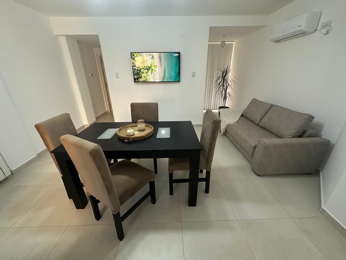 Appartement intérieur de 2 chambres pour 4 personnes au rez-de-chaussée. 📍Emplacement à 2 pâtés de maisons du centre, un demi pâté de maisons du parc de la vie, près de la côte de Villa María. Les animaux de compagnie ne sont pas autorisés. Commodités🏡 Dor. matrimonial Dor. lit marin Cuisine-salle à manger Salle de bains Cour intérieure avec barbecue Wi-Fi Réfrigérateur Micro-ondes Cuisine et four à gaz Smart TV Chauffage Ventilateurs Climatisation Services💡 Nettoyage 1 fois x semaine Literie Linge de toilette Vaisselle complète