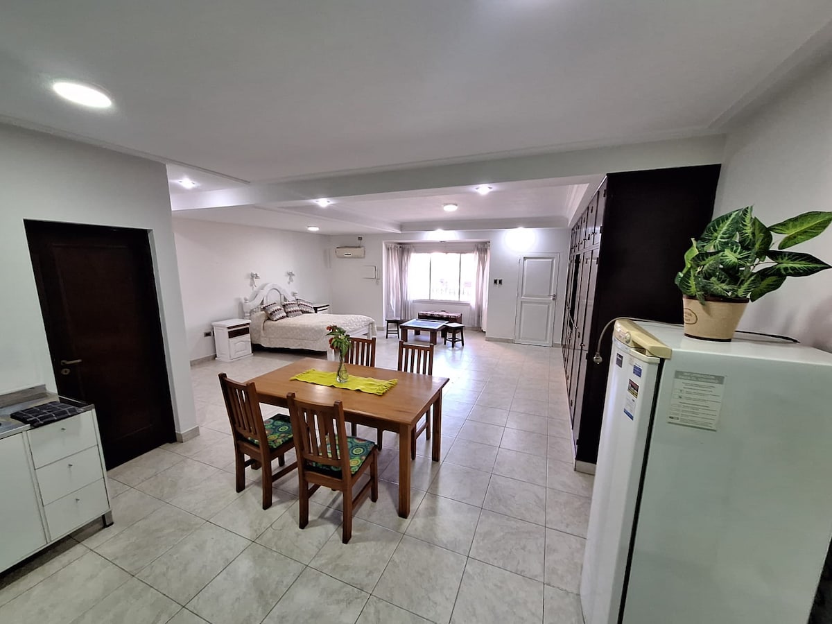 Monoambiente Cómodo y acogedor para dos personas. La cocina esta separada del dormitorio por un separador que sirve para acomodar la ropa. Cuenta con aire acondicionado, televisión de pantalla plana, comedor, pava eléctrica, cocina , frigobar y microondas, toallas y ropa de cama. También tiene un hermoso balcón para disfrutar de una merienda, un trago o charla. En el piso 15 se puede disfrutar de una pileta y una terraza con hermosa vista a la ciudad y al cerro.