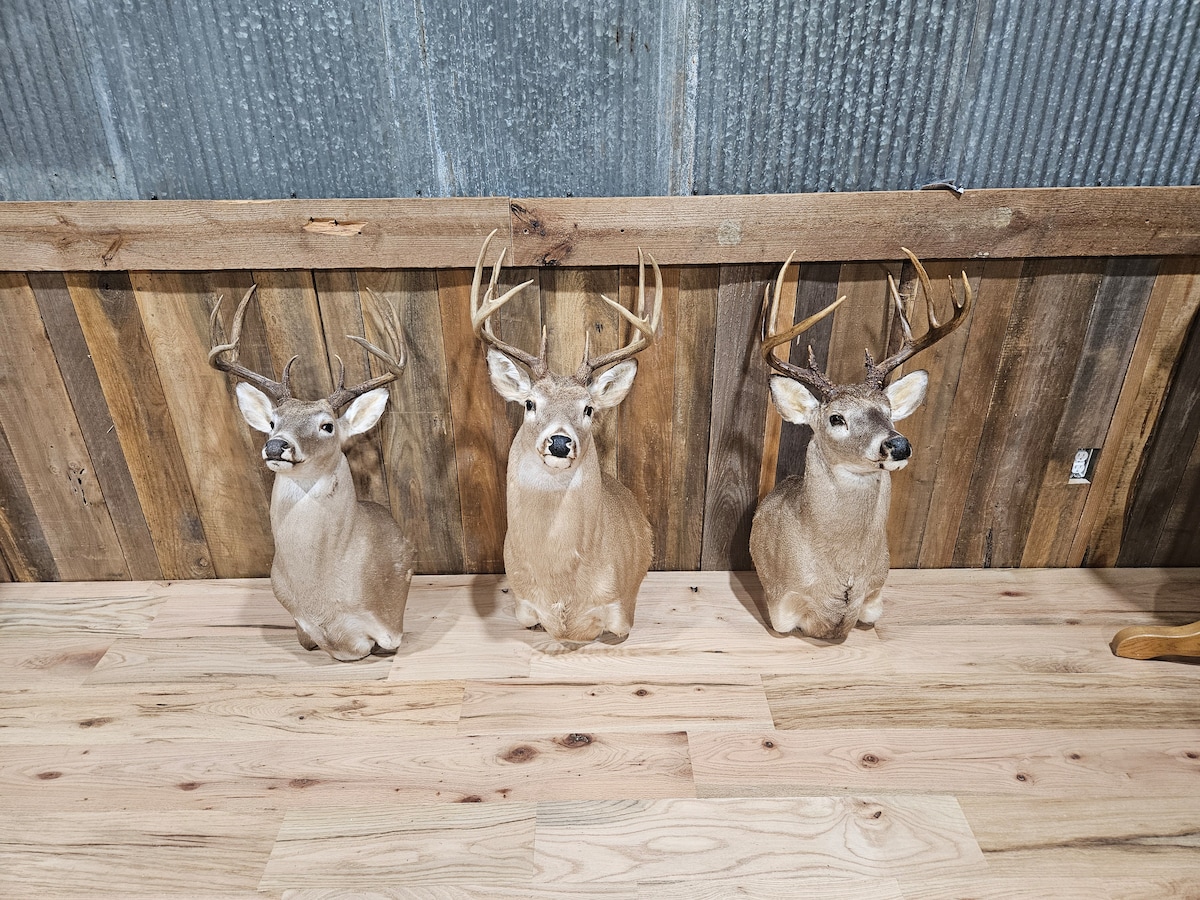 Studio situé sur 20 acres boisés avec 800 pieds carrés d'espace, fabriqué avec des matériaux de récupération en bois et en métal. Grande terrasse donnant sur un lac de 7 acres avec foyer. Entrée privée avec cheminée électrique, télévision, musique, lit Queen Size, canapé, bar avec tabourets, réfrigérateur, surface de cuisson à 2 feux, micro-ondes, Keurig, grille-pain, vaisselle et ustensiles de cuisine. Salle de bain privée avec toilettes sèches, douche et lavabo. Accès au pédalo avec gilets de sauvetage disponibles. Cannes à pêche si vous voulez essayer !