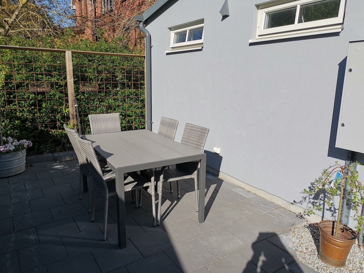 Petit appartement amusant avec sa propre entrée - isolé à l'arrière de notre jardin avec sa propre petite section du jardin. Cuisine entièrement fonctionnelle avec réfrigérateur, plaque à induction, four et four à micro-ondes. WiFi et Apple TV et une petite salle de bain. L'appartement est idéalement situé à côté de Hardebergaspåret - piste cyclable qui vous emmène au centre-ville qui est à 30 minutes à pied ou moins de 10 minutes dans le bus qui circule fréquemment dans le centre-ville.