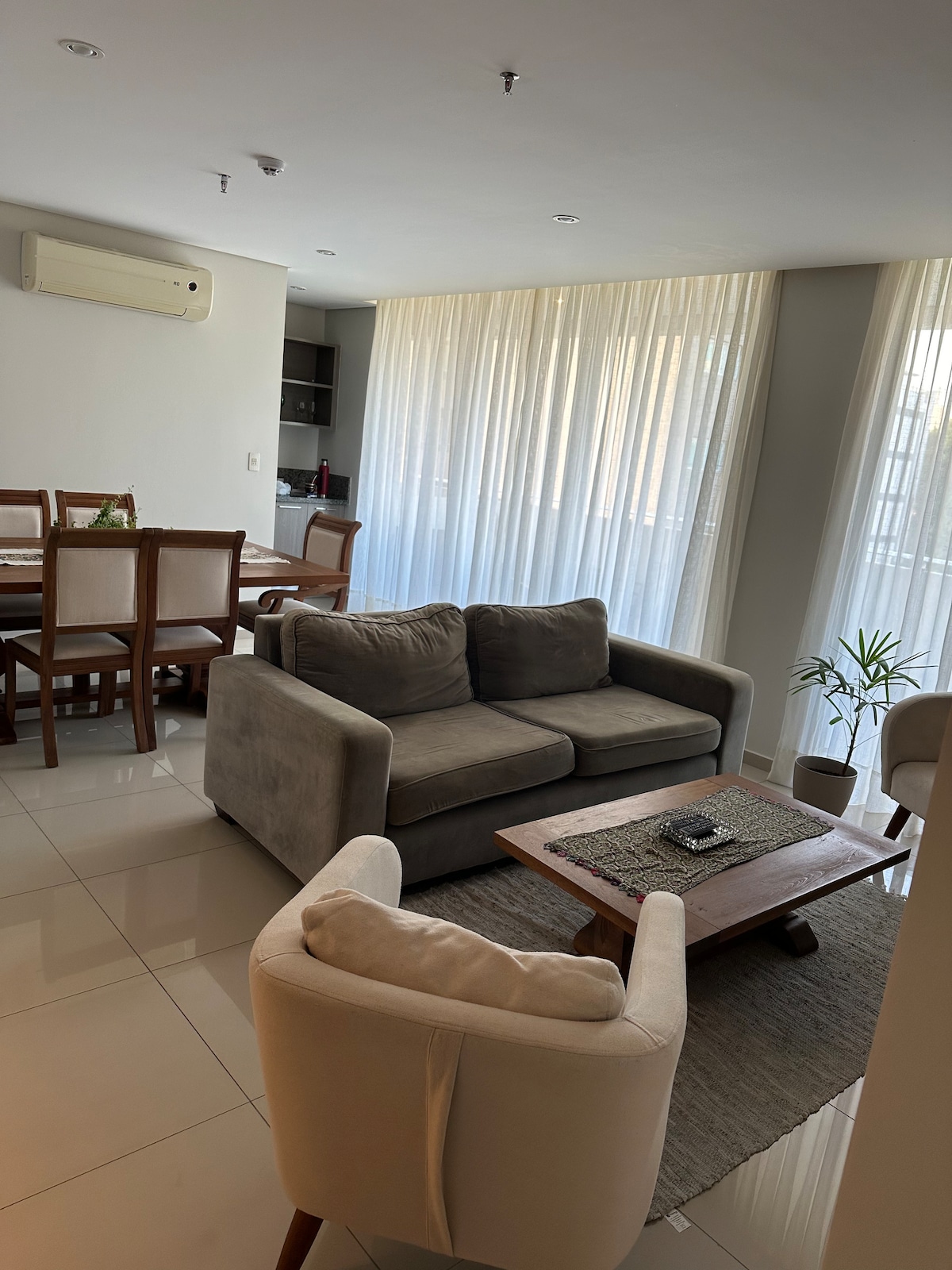 Kick back and relax in this surprisingly roomy studio apartment just outside Asuncion. We have everything for long or short stays. Kitchen is small but fully equipped with fridge, freezer, microwave with grill features, and washer/dryer combo. The complex is near the airport and has ALL THE AMENITIES: padel, tennis, basketball, mini soccer, gym, pool, bar, event space, BBQ, billiards, market, 24/7 security, etc ATTENTION: PARKING SPACE IS NOT INCLUDED, BUT IS AVAILABLE AT AN EXTRA COST.
