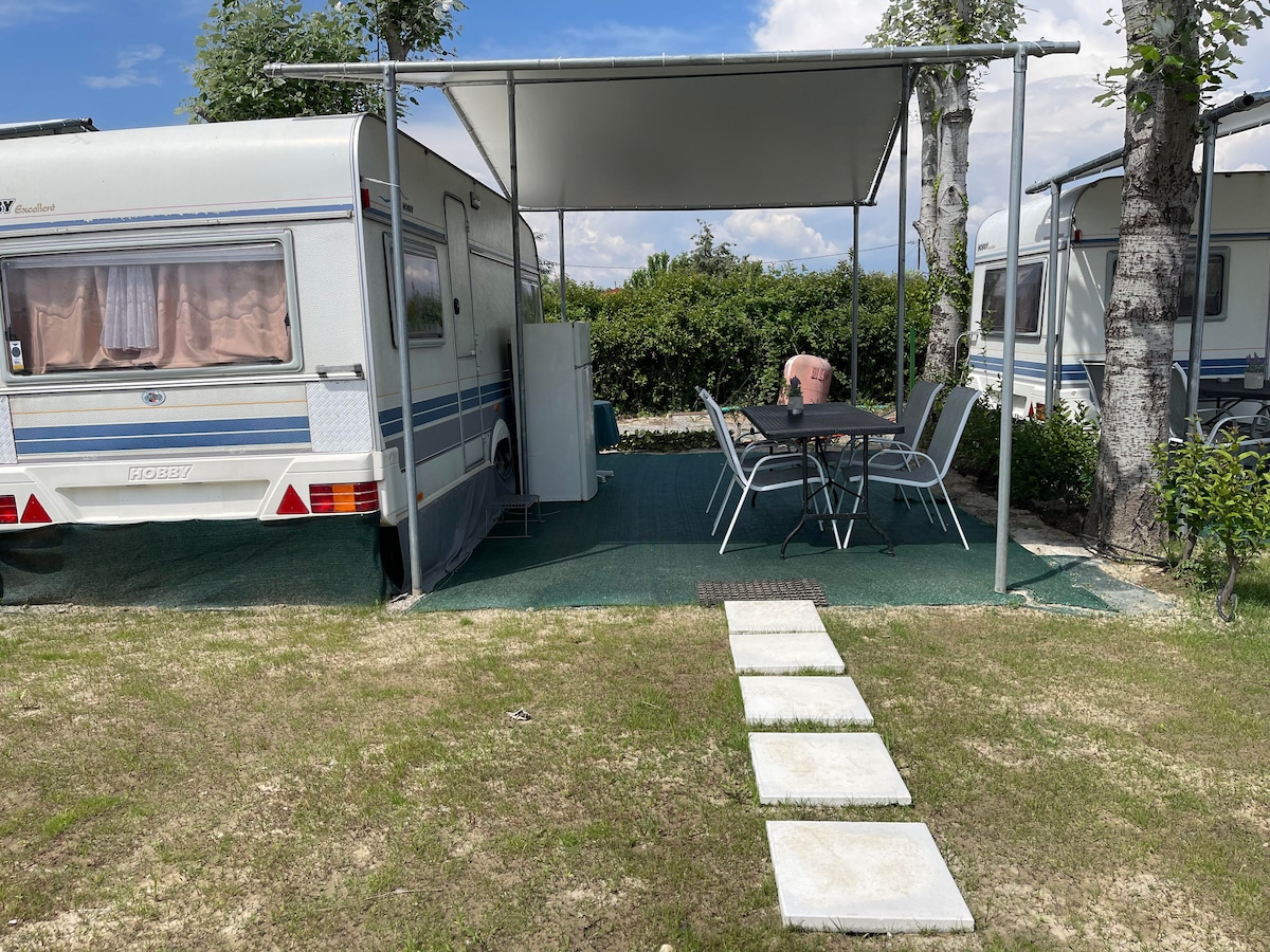 Caravane dans un camping de classe A'55 à côté de la plage