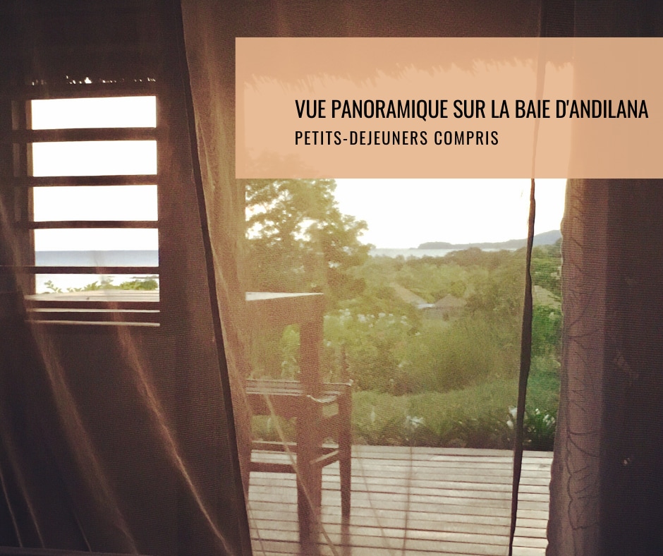 La chambre Masoandro de La Casa Flops c’est la chambre des amoureux mais aussi celle des contemplateurs ! Vous avez une vue imprenable, de votre lit (king-size), sur la mer, la nature environnante et ses arbres majestueux, et surtout sur le lever de soleil derrière la colline... juste sublime. Petit-déjeuner compris