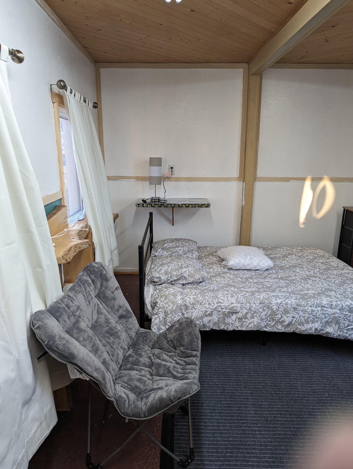 Mini-Micro " chalet " rustique annexé au Gîte ,tout près des enclos de nos Huskys. Petit Espace ouvert avec: 1 lit double + 1 sofa clic clac , salle de bain avec douche et MINI coin cuisinette ; Cafetière Bodum ( presse française ) Cuisine de genre " Motel " 1 rond induction 1 micro onde 1 four grille pain 1 frigidaire ( petit ) C'est vraiment une chambre studio annexé au Gîte. Un Mini studio idéal pour 2 adultes + (et 1 enfant possible.)