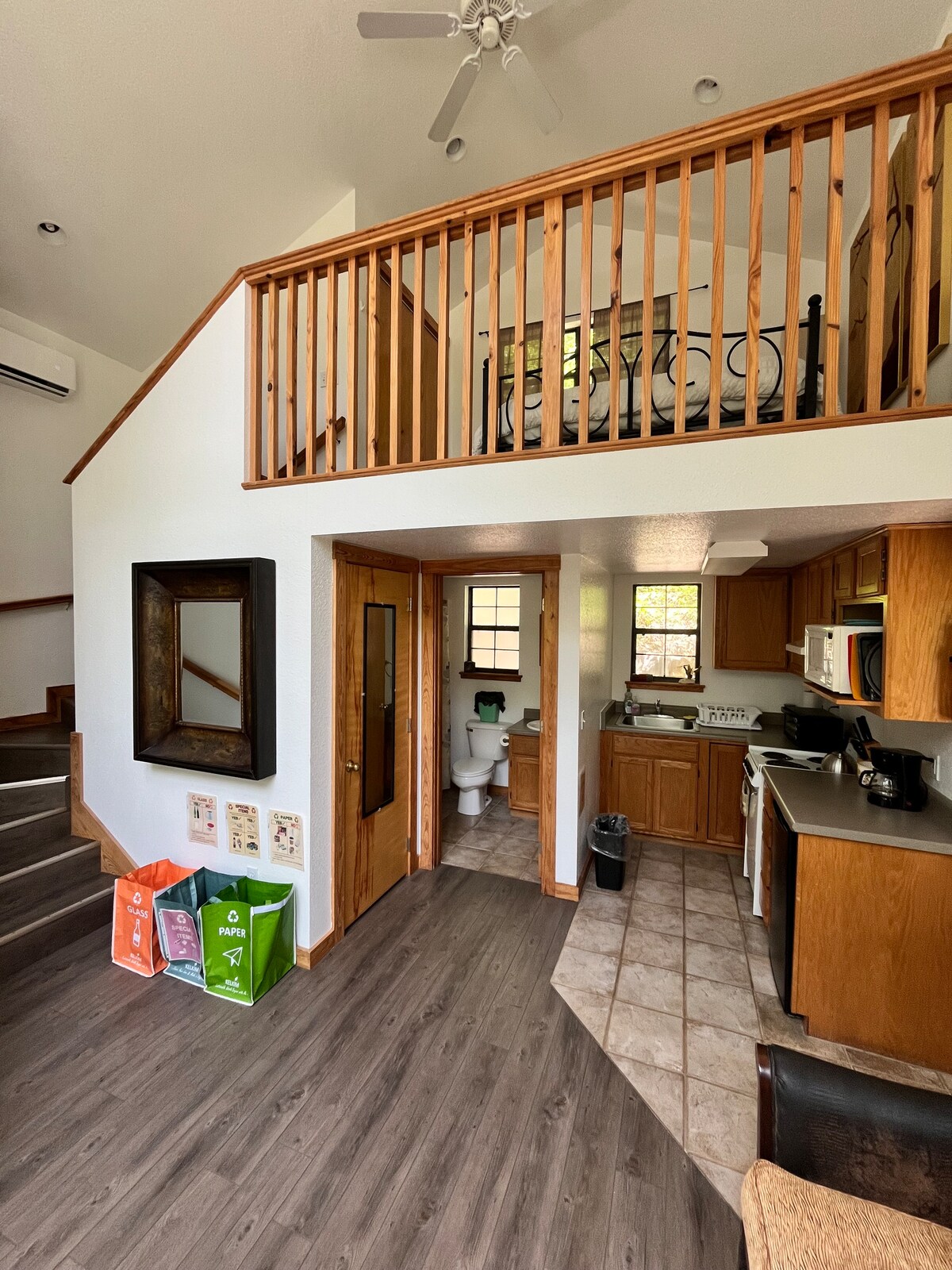 Cet appartement loft a une jolie atmosphère de micro-maison et est situé sur le campus du Ozark Natural Science Center. C'est un endroit très calme et magnifique sur 3 miles de chemin de terre, à 30 minutes d'Eureka Springs. Pendant votre séjour, vous pouvez explorer nos 8 miles de sentiers de randonnée et une carte des sentiers est laissée dans votre appartement. L'espace comprend une cuisine complète. Venez découvrir la nature sauvage avec nous !