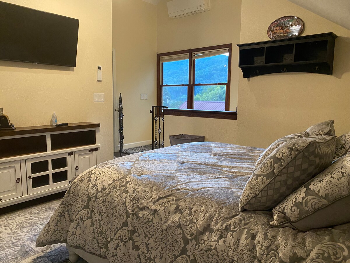 Bienvenue au Starswept Studio ! Respirez l'air de la montagne depuis le balcon de ce studio confortable au-dessus d'un garage détaché dans un quartier paisible et privé. Parfait pour les aventuriers ou ceux qui recherchent une retraite tranquille, ce refuge est à seulement huit minutes de la Blue Ridge Parkway. Entourez-vous de sentiers de randonnée, de cascades, de ski, de faune et de vues imprenables. Notre studio spacieux allie fonctionnalité et confort. REMARQUE : en raison d'allergies familiales graves, nous ne sommes pas en mesure d'accueillir des animaux de compagnie.