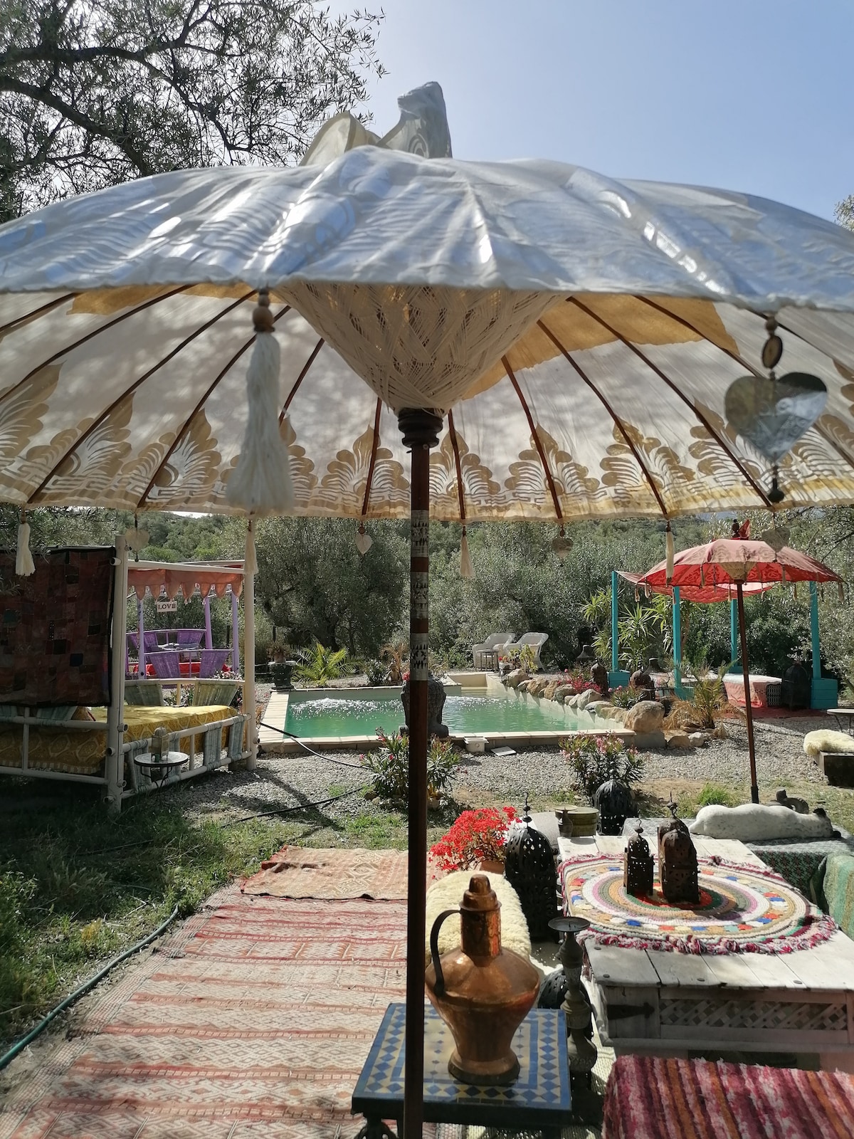 Bienvenue à The Moonlight Yurt, notre authentique yourte mongole privée et autonome, chauffée et climatisée. Il fait partie de Kaouki Hill, un lodge boutique artisanal réparti parmi les anciens arbres d'argan à Sidi Kaouki. Nous sommes surélevés mais abrités sur une colline à quelques kilomètres du village et à 20 min à pied de la plage/surf. Le terrain offre une vue sur les collines, la forêt et l'océan. Passez vos journées à vous détendre et à bronzer et vos soirées allongées sous l'immense ciel nocturne.