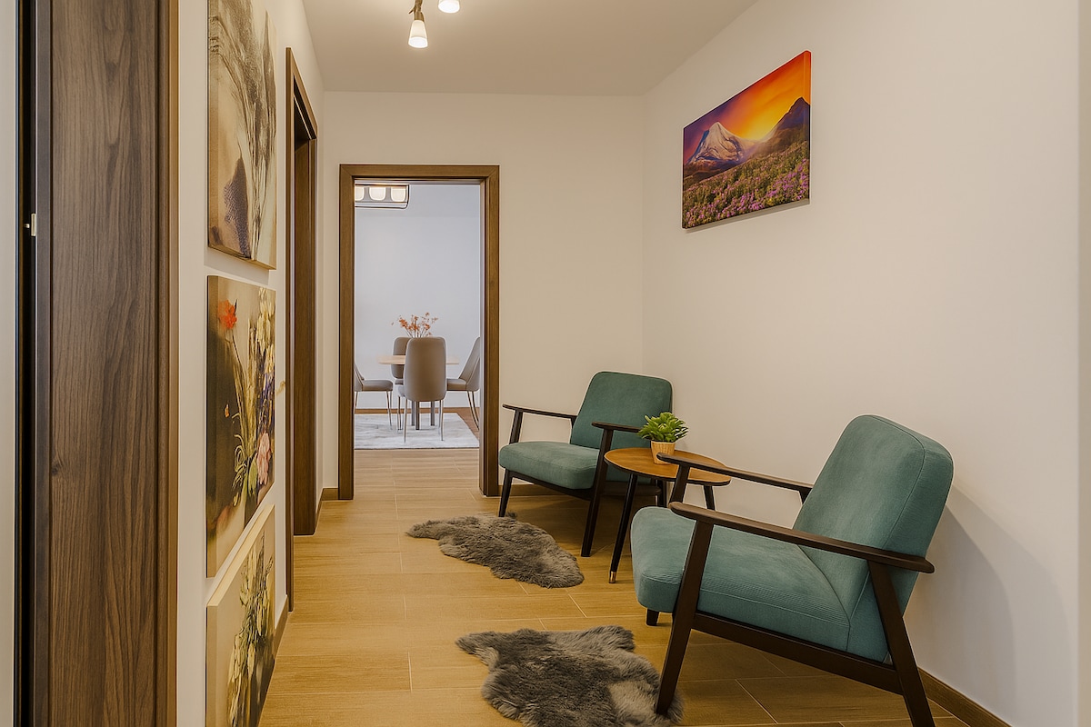 Un design unique et soigneusement conçu, cet appartement combine parfaitement le confort avec de superbes accents scandinaves. Situé dans un nouveau quartier résidentiel, nous allons au-delà pour assurer une expérience unique à nos clients. Notre maison peut accueillir jusqu'à 4 personnes et dispose de son parking. La caractéristique exceptionnelle de ce penthouse est la terrasse spacieuse avec jacuzzi et vue panoramique sur les montagnes, idéale pour les couples ou les familles avec enfants.