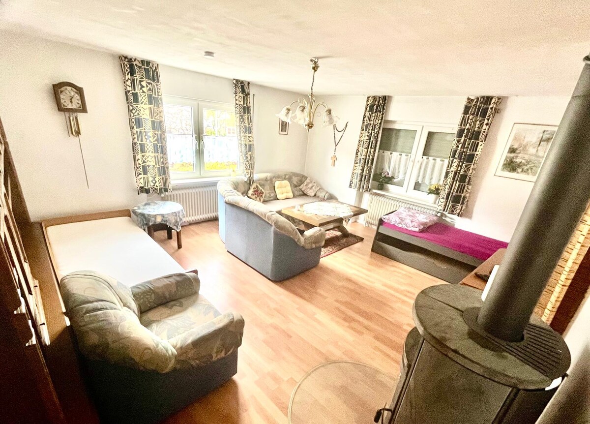 La vieille maison à colombages est située au milieu d'un petit village dans la réserve de biosphère de la Rhön bavaroise. Elle sera habitée par vous tout seul pendant votre séjour. Elle peut accueillir 4 adultes si 2 chambres suffisent. Cependant, il y aurait encore un matelas simple dans le salon. 1-2 chiens sont acceptés. Les vélos ou les motos peuvent être rangés dans la grange.