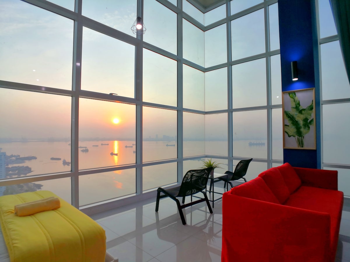 Suites maritimes par Comfy Penang ★ Vue panoramique sur Seaview ★ Sunrise Vue sur le pont de★ Penang ★ Étage supérieur ★ 5 étoiles Superhost Comfy Homestay Team Duplex en bord de mer★ le plus proche de la zone centrale du patrimoine de l'UNESCO • 1000 pieds carrés • 1 parking privé • Wifi 300 Mbit/s • 30 restaurants, cafés, pubs, Starbucks, Coffee Bean, FamilyMart, 7-Eleven sont au niveau 2 de notre maison • Entièrement climatisé • 5 à 10 minutes en voiture de la jetée de Chew et de la vieille ville classée au patrimoine mondial de l'UNESCO.