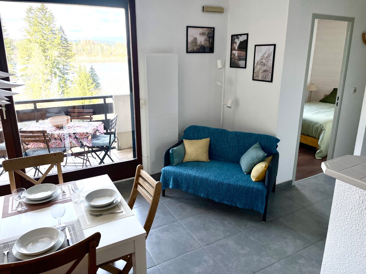 Grand et charmant appartement traversant de plus de 100 m² 🛏️ Capacité : •1 chambre lumineuse avec soleil le matin et lit queen size. •1 chambre lumineuse avec soleil le matin (canapé convertible + bureau). Confortable pour 4 personnes. 🏡 À propos du logement : •Situé au dernier étage •Terrasse couverte avec une magnifique vue sur le lac Saint-Point •Vue imprenable sur la forêt de sapins de l’autre côté •Appartement très équipé •Ambiance chaleureuse •À proximité des pistes de ski