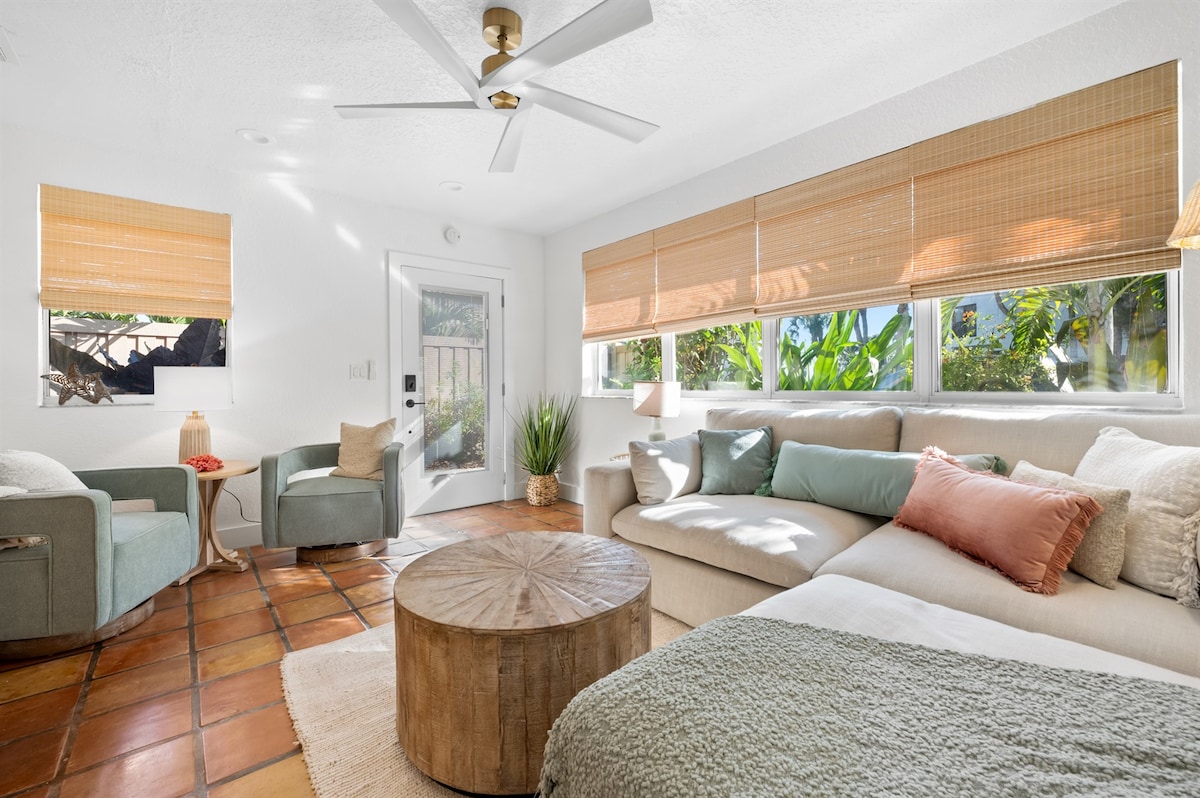 Your peaceful waterfront escape awaits. This cozy 2BR/2BA cottage offers two living areas. The bright Florida room overlooks the canal. It includes areas for a game of ping pong, a life‑size Jenga set, watching tv, having a bite at the table, and a sleeper sofa. Enjoy morning coffee at the dock watching the fish jump or grab your pole. Relax by the sunny pool or practice on the putting green ⛳. Fast WiFi, a dedicated workspace, beach gear, and a full kitchen make winter stays easy and relaxing.