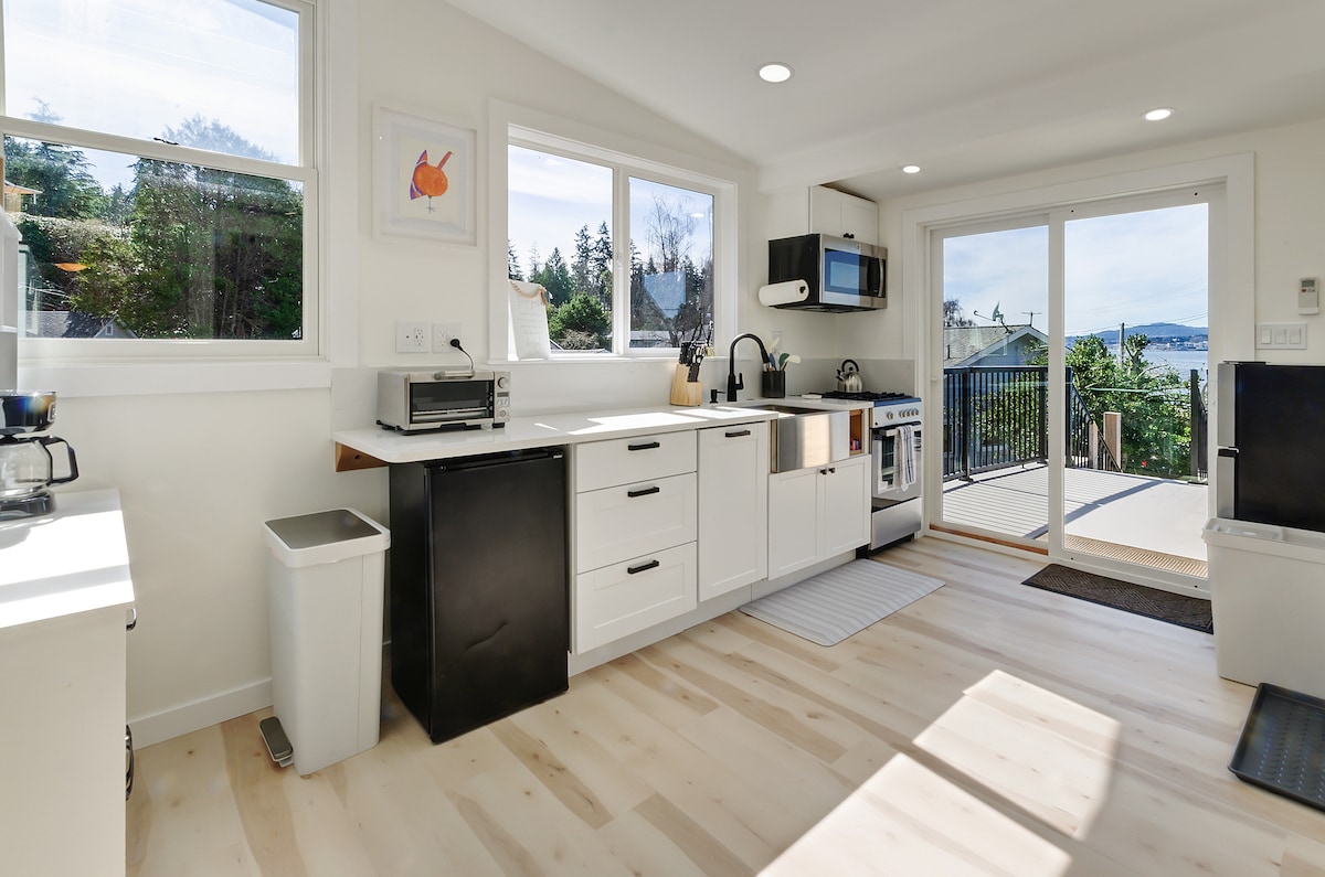 17 fenêtres et 4 puits de lumière inondent cet espace moderne de 900 pieds carrés de lumière et offrent une vue imprenable sur les pins majestueux encadrant l'eau. Profitez d'une promenade de 2 min à pied jusqu'à la plage et de 10 min à pied jusqu'à Battle Point Park. Détendez-vous dans un sauna intérieur, profitez d'une douche à effet pluie surdimensionnée avec baguette à main. Salle de bain avec double vasque et chauffage au sol radiant. Profitez de la cuisine et du divertissement dans une cuisine entièrement équipée avec un grand bar en îlot, une table de cuisson à gaz de chef, un double four et un réfrigérateur/congélateur de taille normale. Voyagez léger ! Équipé d'un lave-linge/sèche-linge.