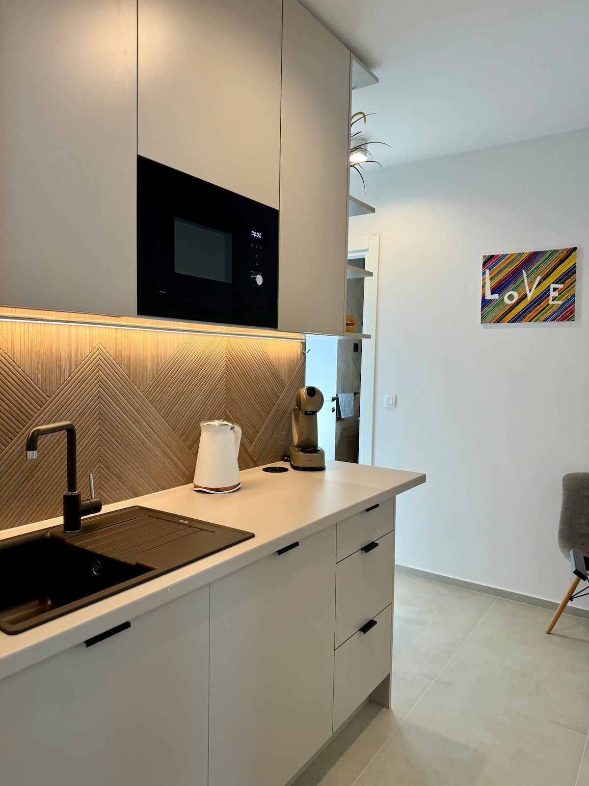 L'appartement sans balcon est situé au deuxième étage d'une maison neuve et élégante. Elle se trouve à seulement 50 m de la mer. L'emplacement est idéal pour la baignade et les promenades sur la plage. L'appartement est entièrement équipé et dispose d'une grande salle de bain et d'une grande chambre ; dans la cuisine, plus petite, vous trouverez tout le nécessaire pour préparer des repas. C'est fait pour un couple. Pour vous libérer des soucis lorsque vous arrivez en retard, l'appartement dispose d'eau pour se rafraîchir, de capsules de café pour le premier matin et d'un gel douche jetable dans la salle de bain.