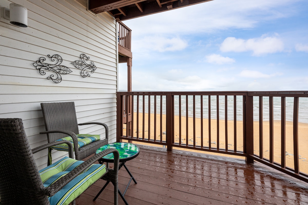 Faites comme chez vous et détendez-vous dans ce studio rénové et nouvellement meublé au complexe hôtelier The Shores of the Grand Traverse. Ce condo en bord de baie au deuxième étage dispose d'un balcon à l'ambiance isolée avec une excellente vue sur le coucher de soleil sur East Bay. L'appartement est lumineux et joliment décoré. Il y a une grande télévision à écran plat et une salle de bain complète. La kitchenette comprend un four à micro-ondes, un réfrigérateur et une double cuisinière pour préparer un repas chaud pendant votre séjour.