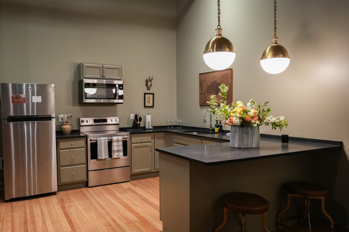Plongez dans le charme d'une époque révolue dans Elk, un appartement spacieux de 1 000 pieds carrés nommé d'après la salle de danse historique Elk Lodge que cet espace occupe partiellement. Cette unité unique est pleine de caractère vintage, avec des plafonds en étain anciens magnifiquement conservés et des planchers en pin de 100 ans qui racontent leur propre histoire.