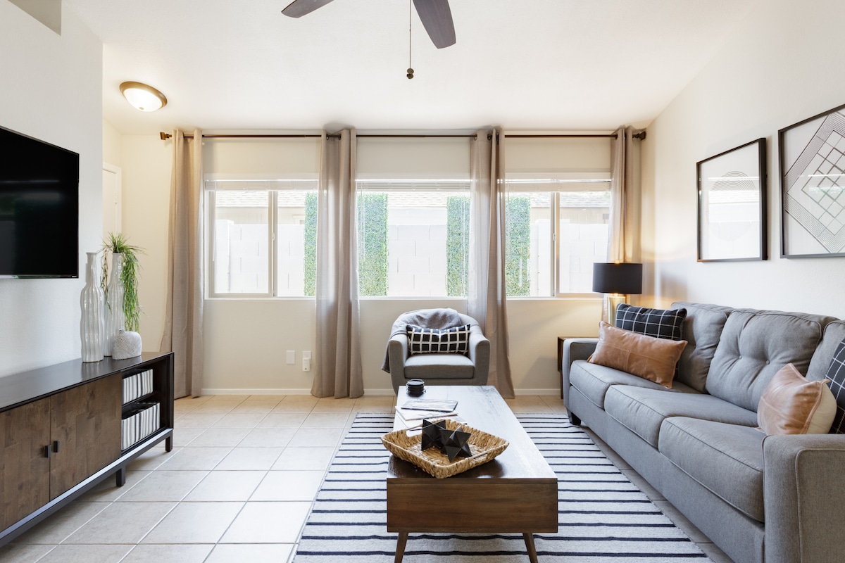 Petite copropriété confortable idéalement située près du cœur de Mesa. À proximité des restaurants🍔, des magasins🛍️ ⚾️, des stades de baseball et de diverses attractions. Entièrement meublé, avec 2 chambres, CHACUNE avec un lit queen size, un dressing et une salle de bain à proximité. La cuisine est entièrement équipée pour cuisiner avec un petit coin repas. Petit lave-linge/sèche-linge. Accès à HBO Max et Hulu. Petit patio semi-couvert. Les visiteurs auront également accès à la piscine communautaire et au jacuzzi. Animaux acceptés pour les petits chiens🐕.