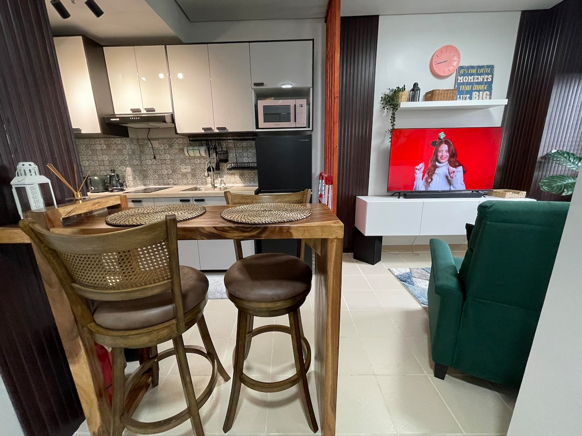 Un studio douillet et confortable situé au cœur de SMDC Cheer Residences à Marilao, Bulacan ! Notre unité est entièrement meublée et équipée avec tout ce dont vous avez besoin pour un séjour confortable et agréable, y compris un lit Queen Size confortable, un canapé-lit, une télévision à écran plat, une table à manger, une kitchenette avec un réfrigérateur, un micro-ondes, une bouilloire électrique et des ustensiles de cuisine de base, une salle de bain privée avec une douche chaude et froide, une piscine, une sécurité 24h/24 et un bureau de réception.