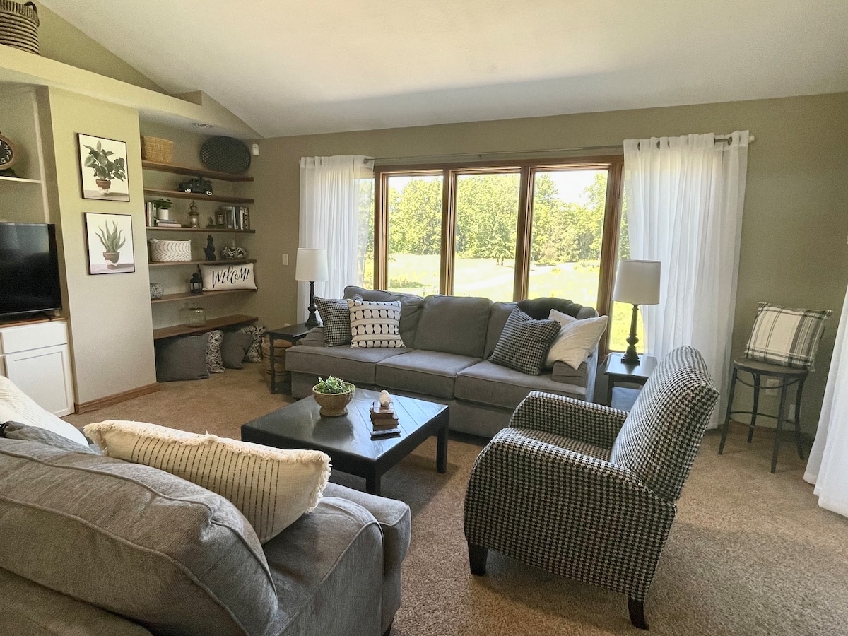 Au centre de Michiana, spacieux et serein, prévoyez de vous détendre à la campagne ! La faune se promène dans la cour, les étoiles brillent la nuit. Promenez-vous dans la grande propriété ou blottissez-vous avec un ordinateur portable ou un livre ; vous pouvez vous détendre et vous relaxer pendant une heure ou des jours, à vous de choisir ! Profitez d'un repas ou aventurez-vous à l'extérieur pour goûter aux offres locales à quelques minutes. Apportez un vélo : beaucoup de routes de campagne à explorer ! Vous aimez la pêche ? La région compte une douzaine de petits et grands lacs. Laissez cette maison être votre base d'exploration ou votre lieu de repos paisible.