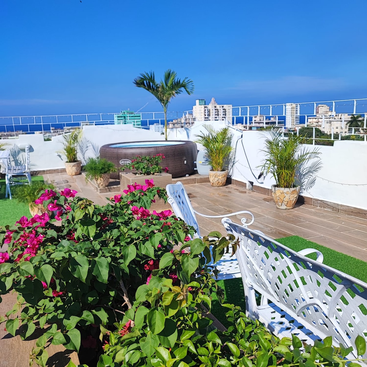 Sensacional espacio en el Vedado, a dos pasos del Malecón, con vistas a la ciudad y el mar, le invitamos a relajarse y aislarse del bullicio citadino, gracias a la espaciosa terraza que domina el barrio. Una habitación, salón y baño independiente. Cama King size que puede separarse en dos camas twin . WIFI gratis . Contamos con paneles solares y baterías que permiten tener electricidad y funcionamiento de los equipos menos los AC. Para esta situación tenemos ventiladores que podrás utilizar.