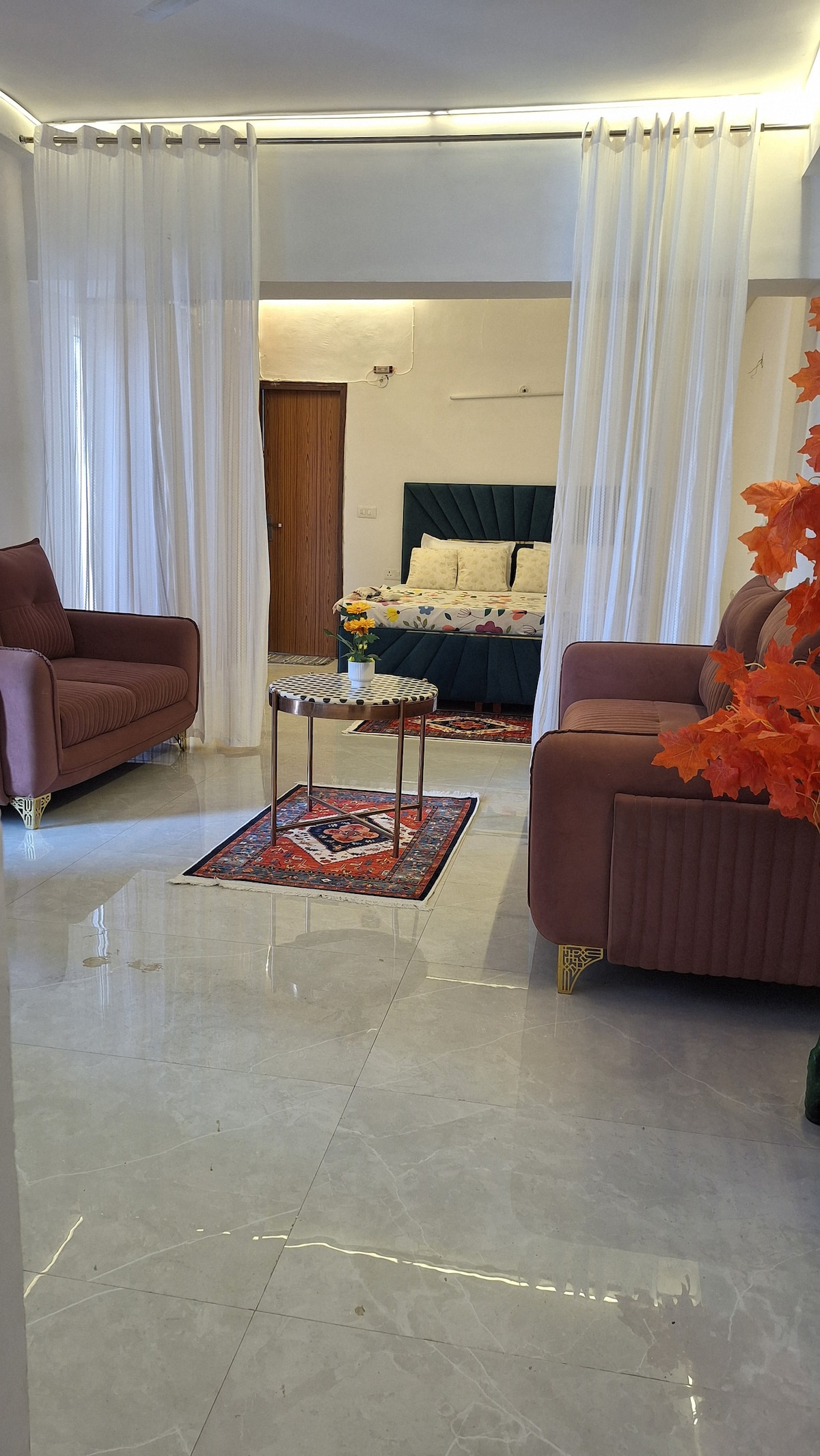 About This Property:- ✨ Master Bedroom – Featuring a Super King-size bed with an ultra-luxury Sleepwell mattress (worth ₹1.3L) for unmatched comfort, a 3-seater plush sofa, split AC, smart ceiling fan, 65-inch Android QLED TV with JBL soundbar, attached washroom, and thoughtfully designed lighting that creates a cozy, welcoming vibe. 🌿 Spacious Garden – Enjoy a 330 sq. ft. private garden with a stylish seating area, perfect for moonlit nights with fancy warm wall lights for a serene ambiance.