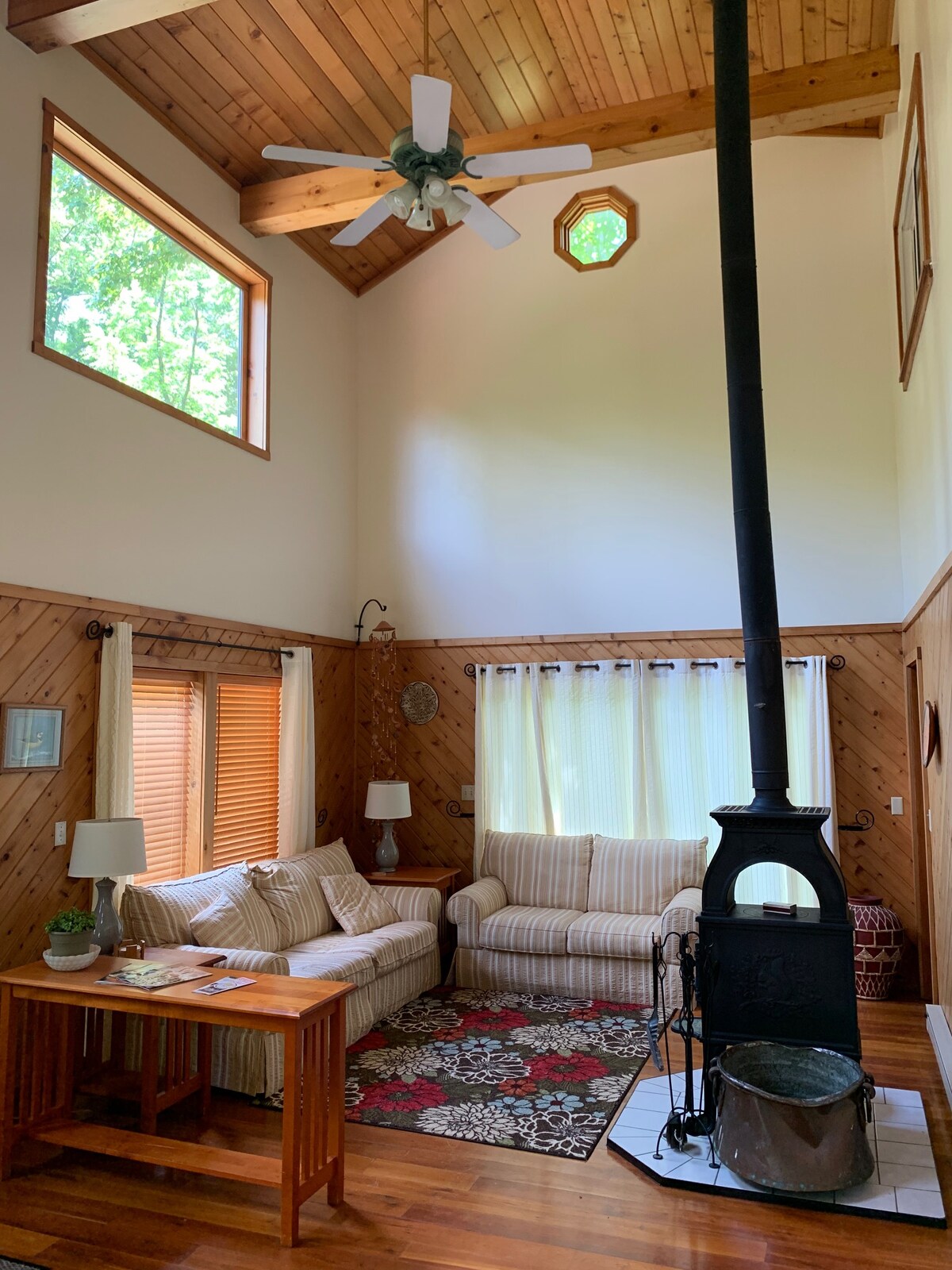 Venez vous immerger dans la nature dans notre confortable cabane de campagne. Cuisine intérieure entièrement approvisionnée avec de nouveaux appareils électroménagers, y compris un lave-linge et un sèche-linge. Divertissement intérieur : cartes, quelques jeux de société, crayons de couleur et papier, télévision avec lecteur DVD et plusieurs disques, une bibliothèque. Divertissement extérieur : filet et équipement de badminton, hamac, barbecue, foyer et banc de pique-nique. Cabane nichée au milieu des arbres. Deux chambres avec 4 lits jumeaux qui peuvent être rapprochés pour faire 2 lits King Size, plus futon dans le séjour.