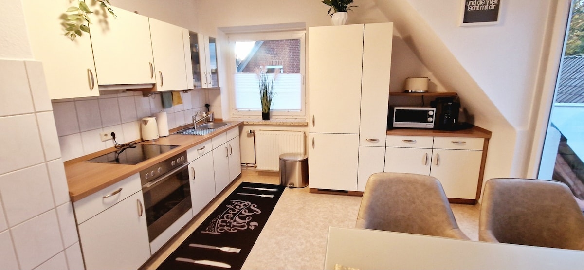 Spacieux appartement de 75 m² à Sulingen, calme et central. Peut accueillir jusqu'à 5 personnes : deux chambres séparées avec deux lits simples sur demande comme lit double, salon confortable avec un grand canapé-lit. Cuisine entièrement équipée pour cuisiner comme à la maison. Salle de bain moderne avec machine à laver. Toutes les chambres disposent d'une Smart TV. Terrasse couverte. Commerces et boulangeries à distance de marche. Idéal pour familles, amis ou voyage d'affaires. Vivre confortablement et bien entretenu