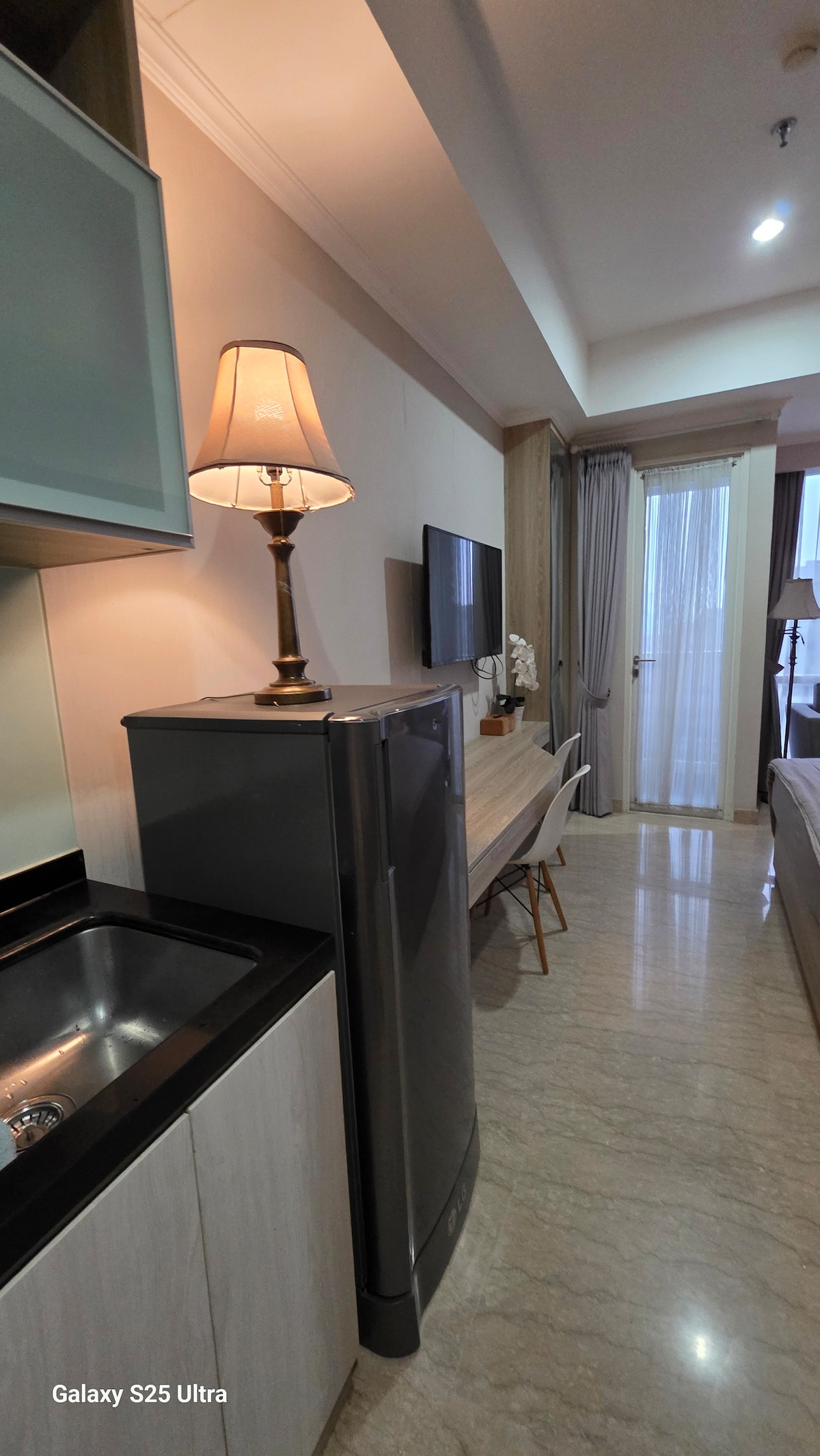 An elegant 24sqm studio in Jakarta's center, blending style and convenience. Includes kitchen, fast Wi-Fi, air-purification, 43" smart TV, sound system and Netflix. It is ideal for various stay types, with contactless access and amenities like pools, jacuzzi, gym, and basketball, Now features a Reverse Osmosis dispenser & food waste disposal, The picture shows a gas stove that has been replaced by an induction cooker (to follow the apartment guidelines for fire hazards)