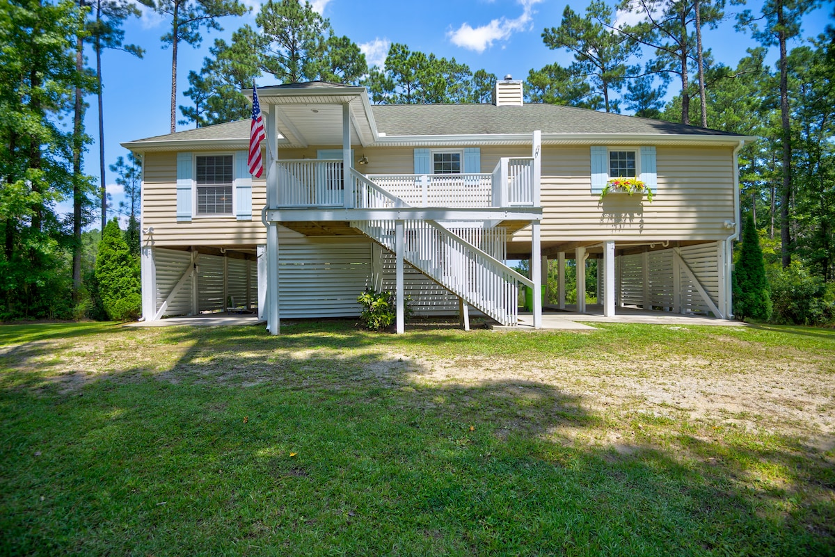 Un chalet de campagne mignon, charmant, ouvert et aéré à seulement 10 minutes du centre-ville de New Bern. À distance de marche de la rivière Neuse et à 5 minutes du débarcadère public. Cadre boisé avec des observations occasionnelles de cerfs, de dinde sauvage, de hiboux et de faucons. Calme et paisible ! Un endroit idéal pour se détendre et se ressourcer. Pratique pour Bayboro, Vanceboro, Cherry Point, Havelock, Morehead City et la plage. (Pas de frais de ménage.)