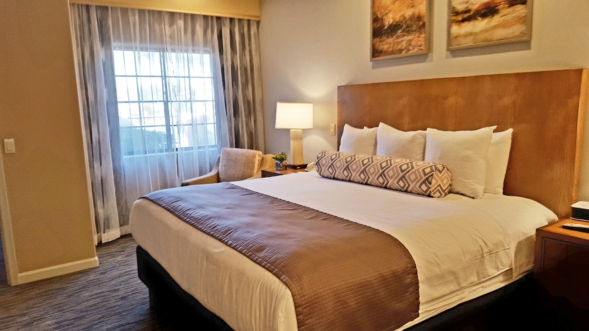 A Signature King Suite located inside the iconic Hotel Valley Ho, a Mid Century modern 4-star hotel in the heart old town Scottsdale! First class restaurants, shops, and museums all within walking distance. You'll have a private patio overlooking Camelback Mountain, king size bed, bathroom with a full soaking tub, separate shower, and kitchenette. Access to all hotel amenities: two heated pools, spa, work-out facilities, restaurant, room service. No resort fee! Helpful staff on site 24/7.