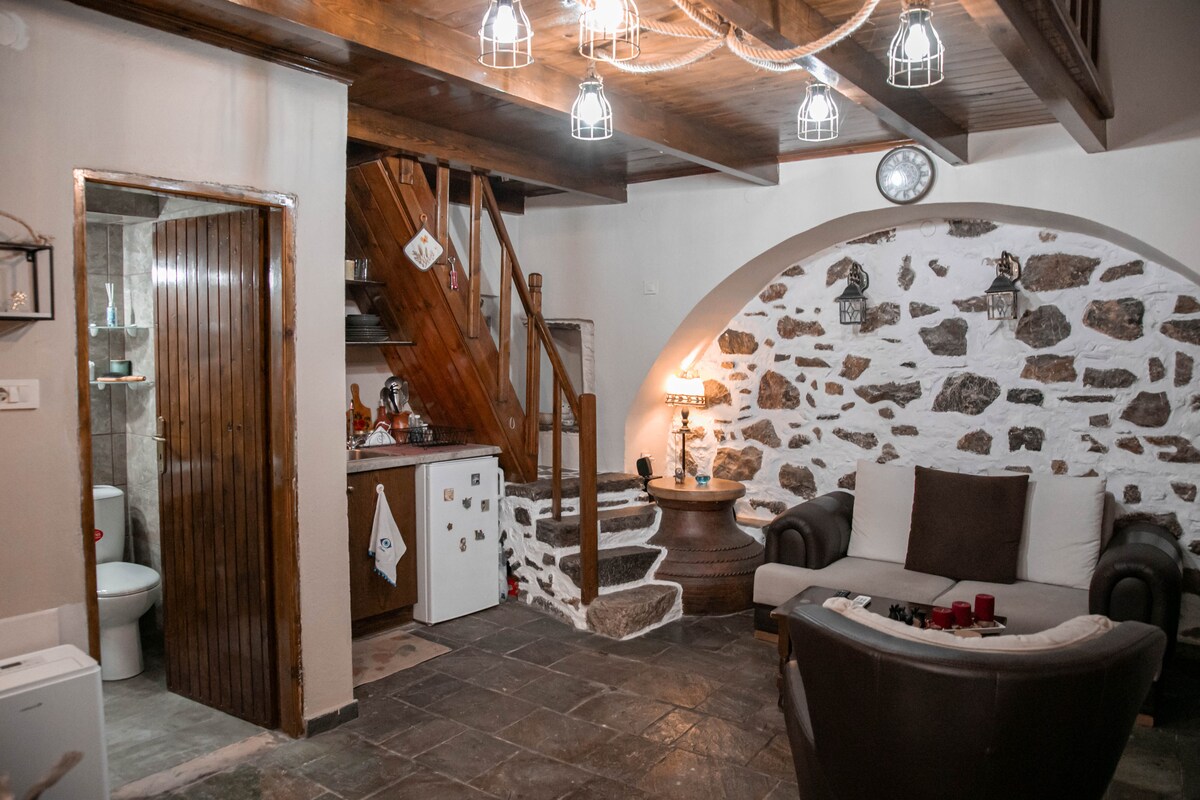 Réaménagement d'une maison byzantine en 2022 sous la supervision archéologique avec des produits de construction originaux et absolument aucun changement à la structure de la maison qui fait partie d'un château construit il y a environ 950ans. Chambre principale avec un lit Queen Size et un lit double sur une structure en bois surélevée qui a été reconstruite à la scène originale et peut accueillir 2 adultes/enfants supplémentaires. L'autre chambre est également la salle de télévision avec un matelas queen size pour 2 personnes supplémentaires. La maison est très unique et originale