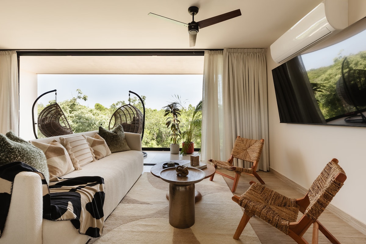 True luxury studio apartment with nature views and spacious patio on the 2nd floor at Panoramic Tulum. Enjoy the incredible 360º infinity rooftop pool and vivid neighborhood of La Veleta, only 15 minutes from the amazing Tulum beaches while close to town. You will have strong A/C, fast Wifi (32 Mbps fiber), blackout curtains, large smart TV, fully equipped kitchen, gym access, and access to the beautifully designed rooftop and 360º pool.