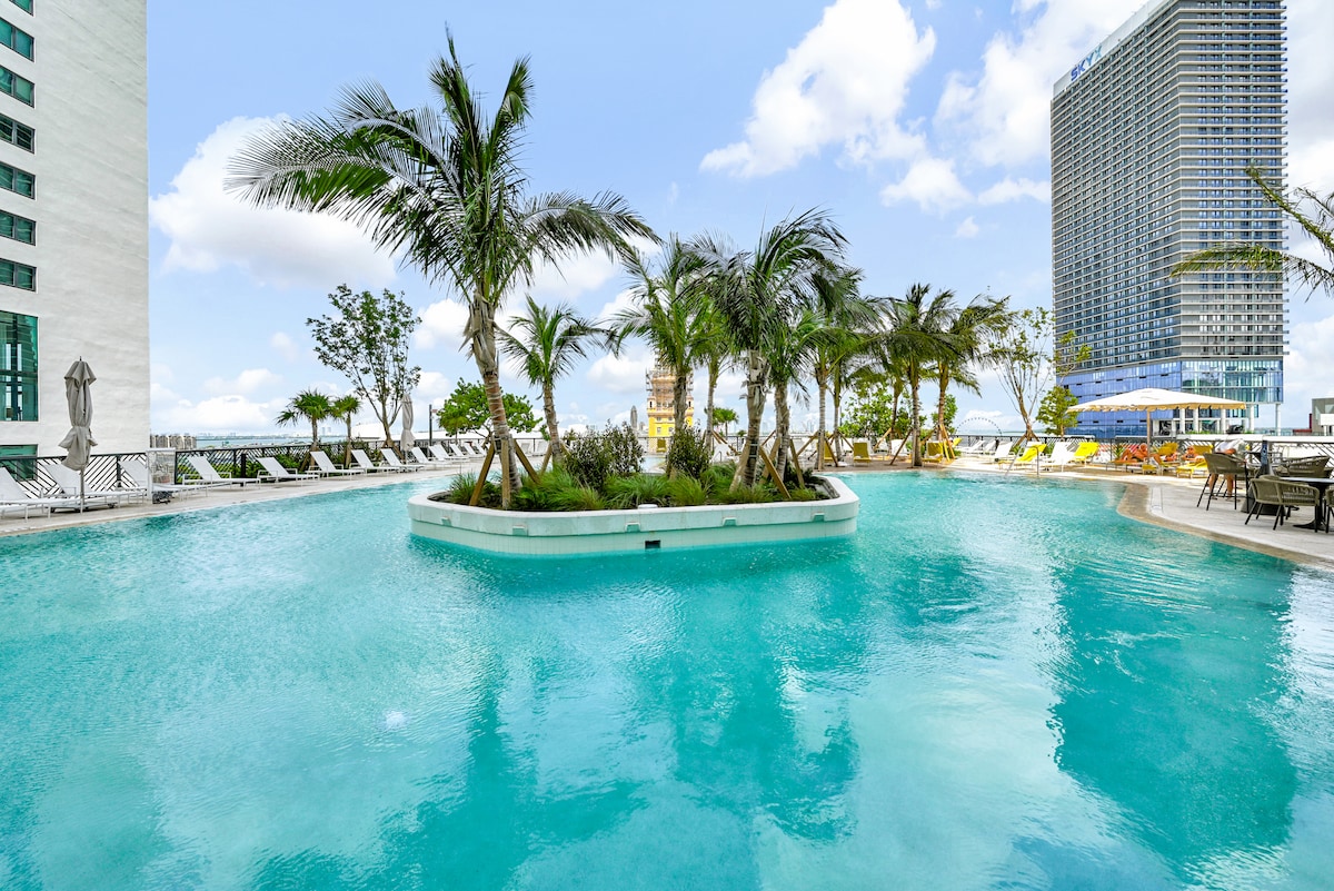 Sortez sur votre balcon et admirez les paquebots de croisière qui glissent sur la baie tandis que la ville s'éveille en contrebas. Ce grand appartement d'une chambre au 49e étage, de style hôtel, offre une vue inoubliable. Il est parfait pour les groupes, les familles ou toute personne à la recherche d'une escapade à Miami avec style. Avec une piscine chauffée, un spa de luxe, un buffet de petit-déjeuner et une accessibilité à pied à Bayside et Brickell, c'est Miami bien fait. Spacieux, tout neuf et situé au cœur du centre-ville de Miami - un endroit passionnant où séjourner !