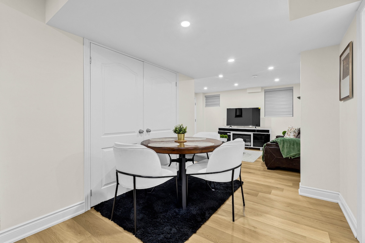 Enjoy your stay in this brand new, bright and modern 1-bedroom basement apartment, with a queen size bed , perfect for families, professionals, or tourists. The apartment features a cozy bedrooms, a fully equipped kitchen, a living room with comfy seating, dedicated dining area and large windows filling every room with natural light. The apartment is minutes away from local parks, shopping, restaurants, and quick highway access for exploring the GTA. No smoking, No pets or parties allowed.