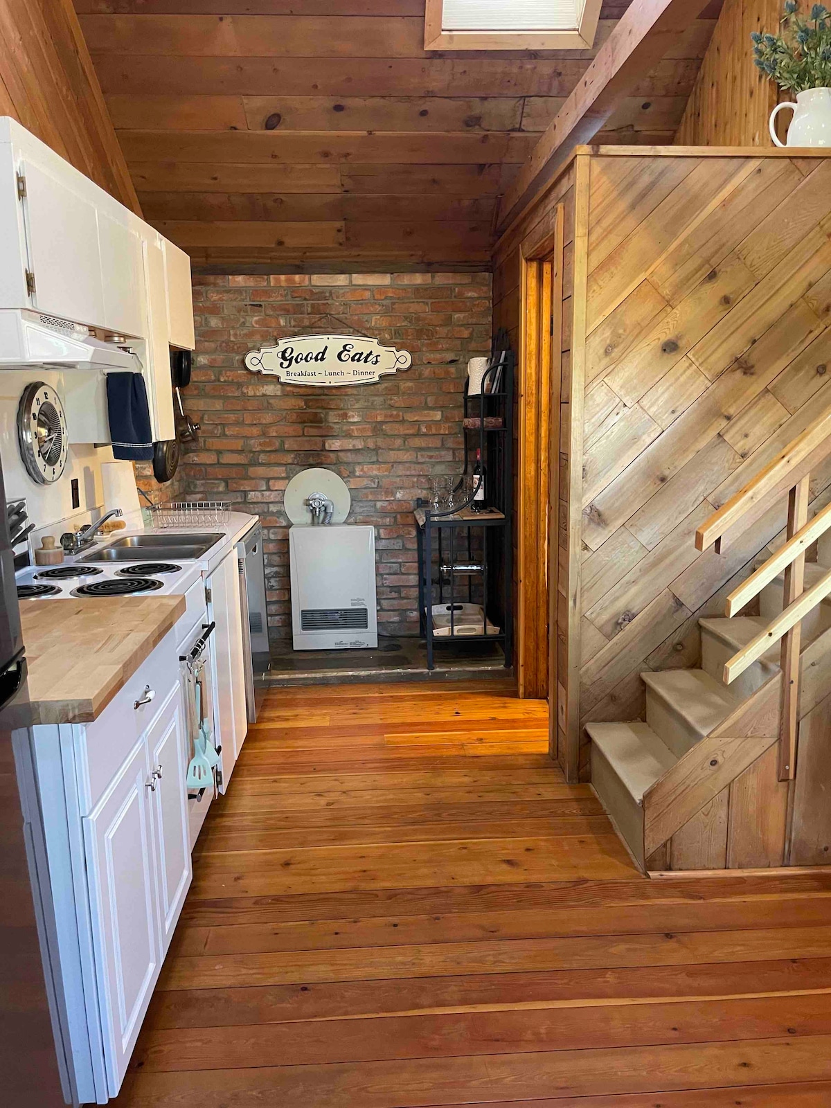 Bordée par une rivière et des champs. Profitez de la vue depuis la terrasse de cette cabane qui peut accueillir 9 personnes. 1,5 miles de rivière à explorer. Plaque de cuisson Blackstone et gril électrique. Grille au foyer. La cabane a un plan ouverte avec un plafond voûté, 2 futons, une causeuse et une table à manger. Il n'y a pas de cuisine ! Il s'agit d'un coin café avec micro-ondes, mini-réfrigérateur, cafetière (ordinaire et dosette), vaisselle jetable. Chambre avec lit Queen Size. Loft avec 3 lits jumeaux. Salle de bain avec douche (attenante à la chambre).