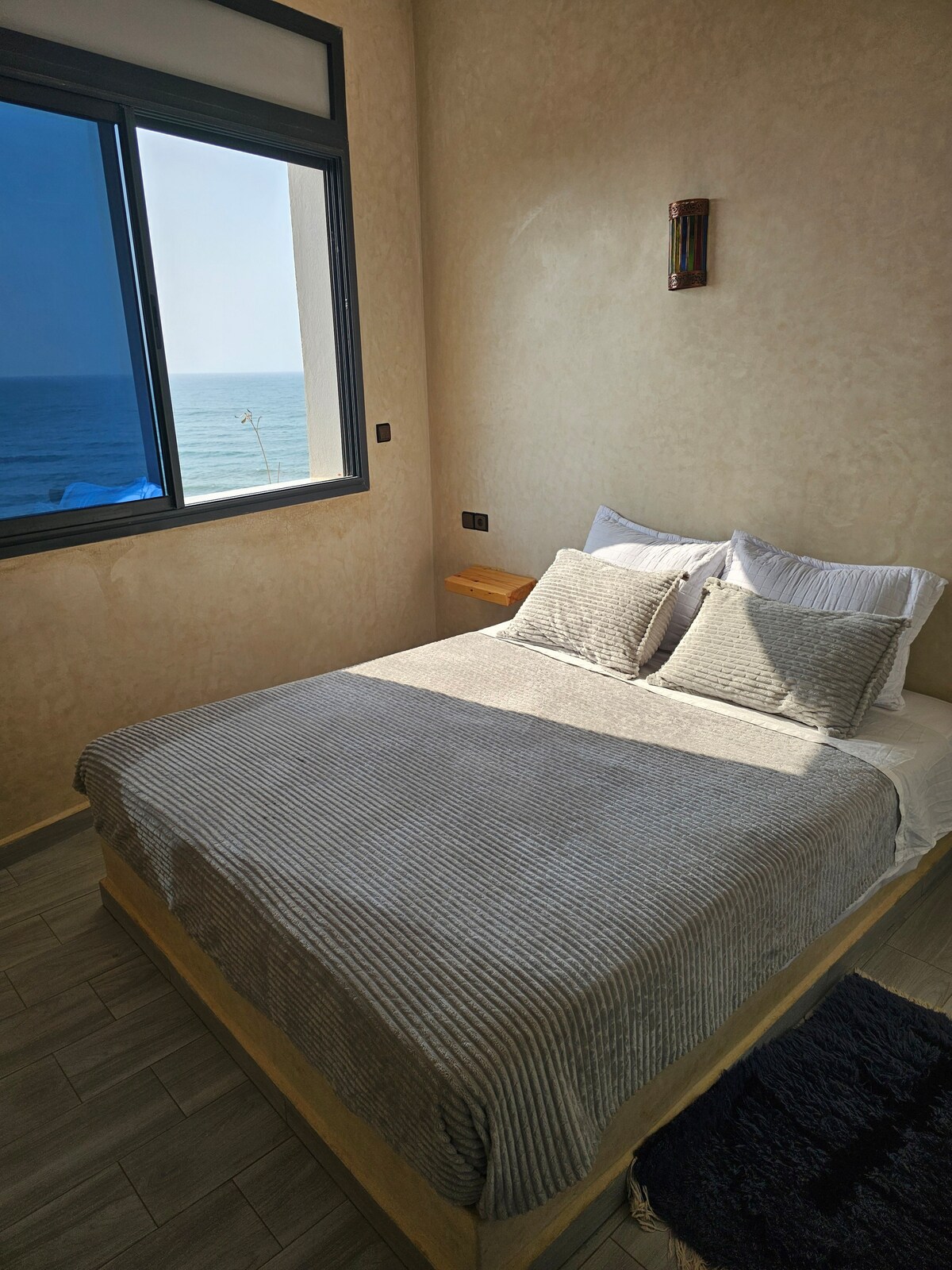 Cet appartement neuf, situé au deuxième étage, se trouve à proximité de la plage et des écoles de surf. Il comprend : *deux chambres : une avec un lit double et l’autre avec deux lits simples *un salon : il peut également accueillir des personnes supplémentaires. * une cuisine avec espace repas *deux toilettes, dont une attenante à la chambre parentale. Localisation exacte: 29°34'49.4"N, 10°02'31.0"W (à vérifier sur Google Maps).