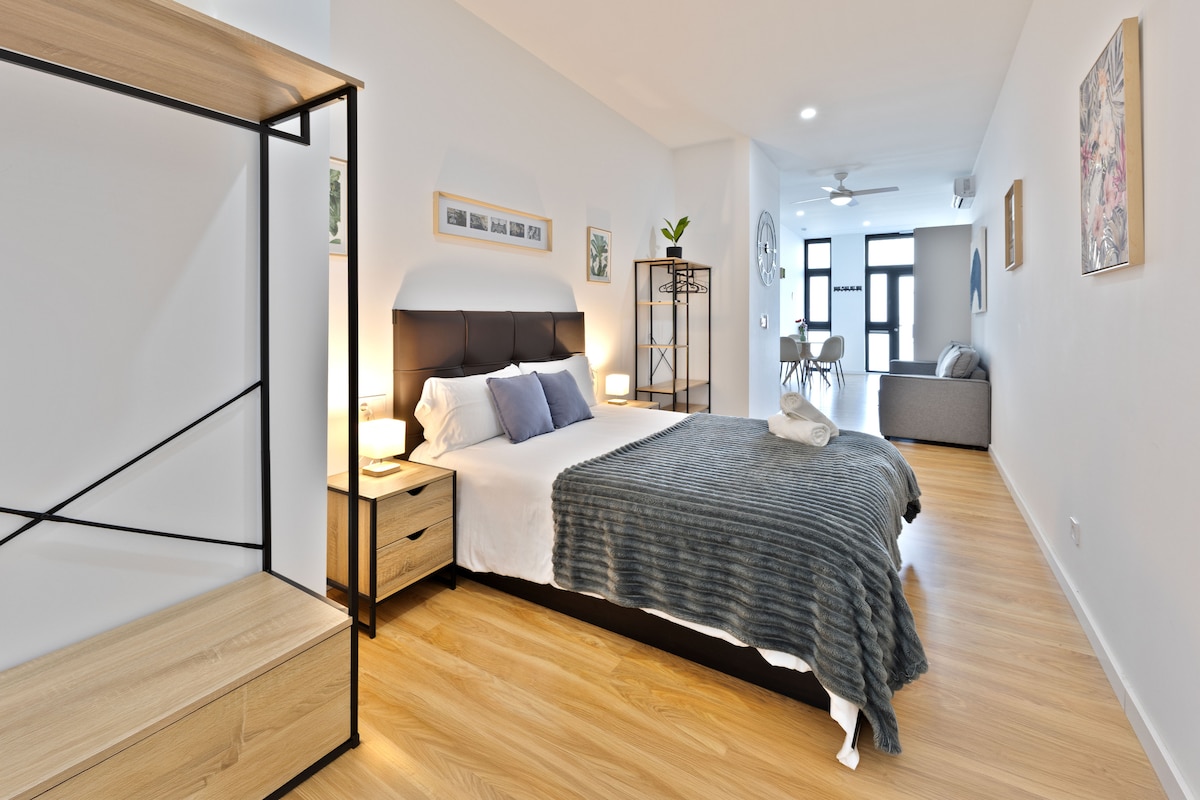 Loft situé au cœur du quartier maritime de Valence, El Cabanyal, à 5 min de la plage de Malvarosa. Maison construite en 1900 et entièrement rénovée sans perdre son essence. Ce superbe appartement fusionne l'architecture traditionnelle avec un design bohème chic dans un cadre texturé naturel. Admirez les hauts plafonds voûtés à poutres en bois et les murs en briques apparentes pendant que vous dînez dans la cuisine en marbre et que vous vous rafraîchissez sous la spacieuse douche à effet pluie.