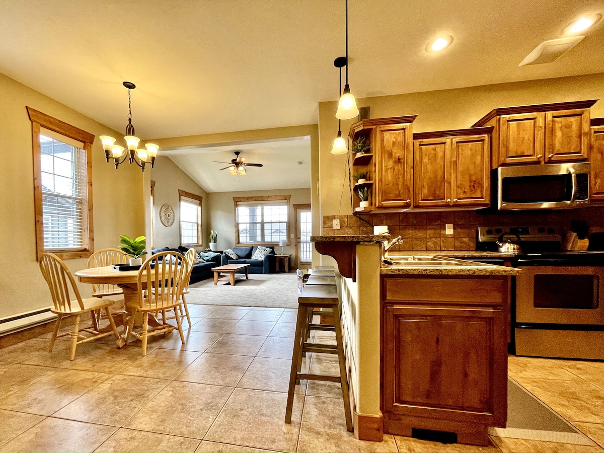– 765 pieds carrés, condo au 1er étage – Patio privé avec vue magnifique sur la montagne – 2 grandes épiceries/magasins d'alcool à 5 minutes à pied – 2 jacuzzis à quelques pas de la porte d'entrée, nettoyés quotidiennement avec vestiaire chauffé – Foyer au gaz efficace – Bus gratuit pour la montagne et le centre-ville — 5 min dans les deux sens – Cuisine entièrement approvisionnée avec épices, mixeur et équipement de cuisine complet – Café, thé et flocons d'avoine gratuits fournis – Savon, shampoing et après-shampoing fournis - À quelques minutes des eaux à truites bleues et du sentier principal.