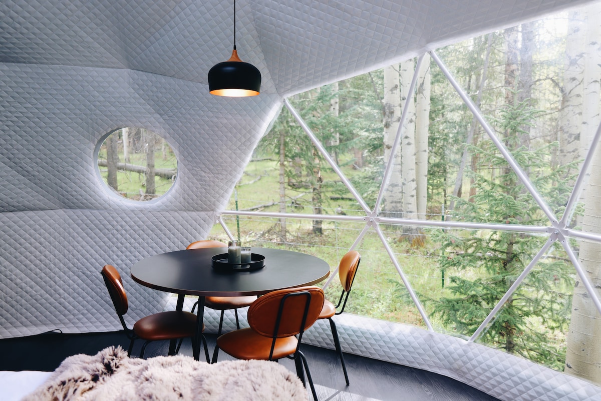 Évadez-vous dans la nature sereine et trouvez un logement dans le charme des montagnes Rocheuses, niché dans un bosquet de trembles isolé à Evergreen, Colorado. Notre dôme géodésique moderne et confortable est entouré de rayons ensoleillés qui se faufilent à travers les pins et les trembles luxuriants et verts, observez la faune errer à travers les arbres, la croissance de la forêt, un ruisseau ruisselant, des cieux étoilés et des lumières scintillantes.