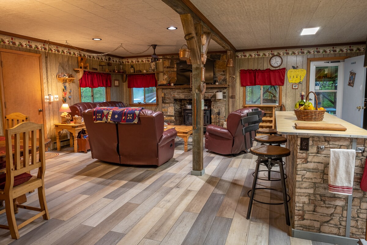 REAL LOG CABIN ON 3 ACRES restored back to former glory Wood authentic décor. 1 mile up overlooking the town of Burnsville and a great mountain view. Paved road all the way up to Peacock Lane. Very safe great neighbors. Peaceful quiet abundant wildlife, deer, chipmunks, rabbits and lots of birds. Pet friendly with approval. Hummingbirds in summer. CHECK OUT THINGS TO DO