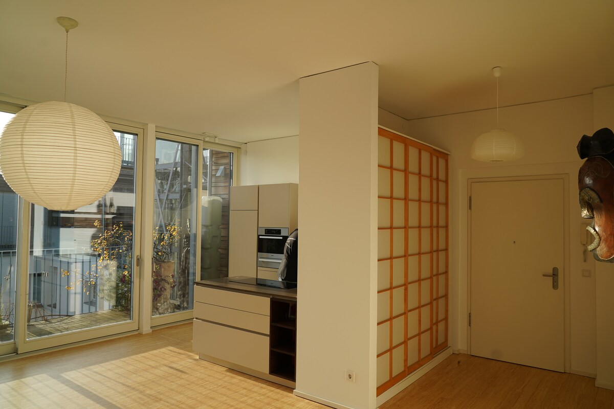 Bienvenue dans mon petit nid de ville Le camping-car de mon frère a été l'inspiration de cet appartement de vacances. Je voulais une retraite pour moi qui offrait tout ce que je trouve important et agréable dans un petit espace : Un lit confortable, une cuisine bien équipée, un espace de rangement et un canapé pour se détendre, et une grande salle de bain avec lave-linge. Le calme était important. Design attrayant et intimité.