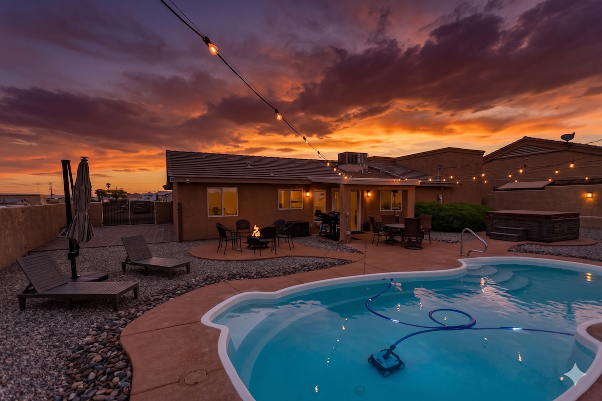 Idéalement situé et à 2 min de la plage de jet ski. Si vous êtes ici pour l'eau, le soleil, le désert ou un peu de tout cela. Notre maison et sa piscine sont votre endroit pour en profiter. Notre maison confortable a récemment été rénovée et améliorée à l'intérieur comme à l'extérieur. Elle peut accueillir 10 personnes avec de la place pour quelques personnes de plus. Nouveaux appareils électroménagers, grand parking pour 8 véhicules ou camions et jouets. À quelques pas de Cypress Park pour les enfants et les animaux. Superbe vue sur le lac également. Barbecue et détente au bord de la piscine et profitez de la soirée.