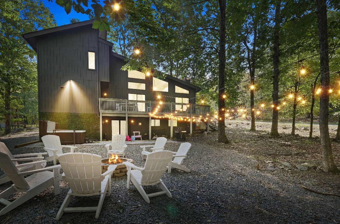 Escape to the designer Black Cabin near Bushkill Falls—your perfect mountain getaway. Surrounded by forest and within walking distance to peaceful creek access for kayaking or fishing, this stylish all black retreat sleeps 6 with two queen bedrooms &a cozy loft. Enjoy the open kitchen with high-end appliances, a warm pellet stove & wraparound deck with gas firepit and outdoor TV. Relax in the wood-fired hot tub or by the firepit under the stars. Only 20 min to Shawnee Mountain & Bushkill Falls.