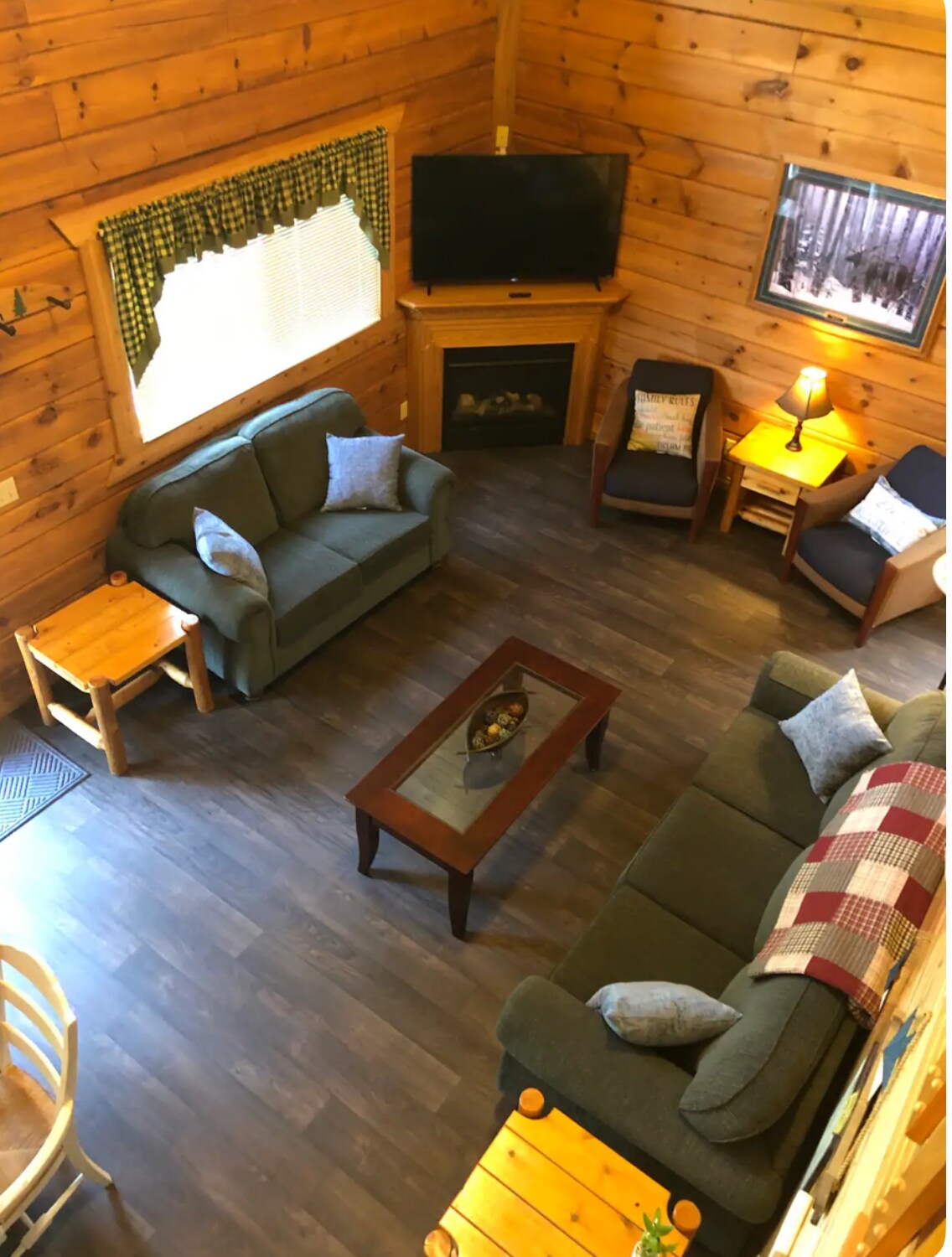 Our cabin is located next the Jellystone Yogi bear campground and Three Bears Lodge. Plenty of parking for ATV’S and trailers in the grass. New furniture in living room. 65 inch TV with Superbox. 2 private bedrooms with queen beds, on main floor. TVs in both rooms/w Ruko 5 twin beds and bathroom upstairs in the loft. 40 inch TV w/Ruko , DVD player Fully stocked kitchen. Washer/dryer. Grill for outdoor cooking. The villa next door may also be available if you have a group larger than 10 .