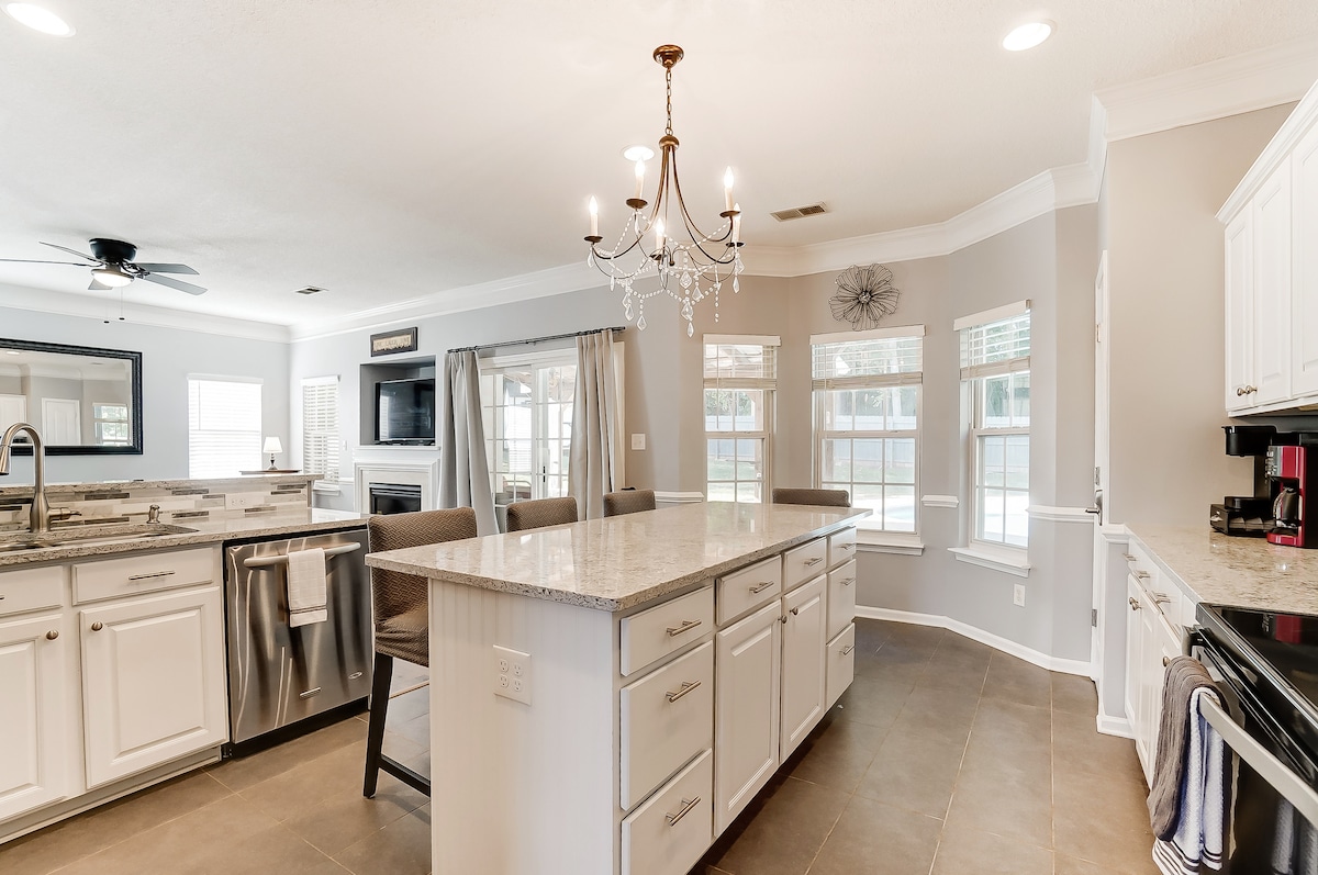 Venez vous détendre dans votre retraite dans l'arrière-cour avec une piscine privée creusée. Lorsque vous entrerez dans la propriété, vous oublierez que vous êtes juste en dehors du centre-ville. Il y a plusieurs espaces extérieurs pour se détendre, y compris un grand porche grillagé, une terrasse surdimensionnée avec espace repas, une grande cour avec chaises Adirondack et un belvédère au bord de la piscine. Cette maison dispose de deux espaces de bureau, de quatre chambres et est équipée d'équipements pour bébé pour accueillir même les plus petits voyageurs. Votre famille se sentira comme chez elle.